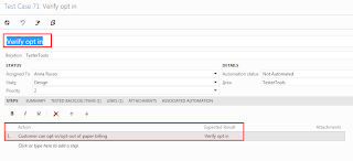 - The resulting test case looks like this with the Acceptance Criteria in the Title and Expected Result field and the PBI in the Action.