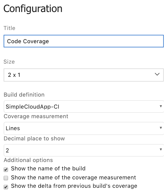 This widget displays the percentage of unit test code coverage based on a selected build definition. If a build definition does not have any unit tests results recognized by the widget or if has not yet been configured, it will indicate so with a message displayed within the widget.