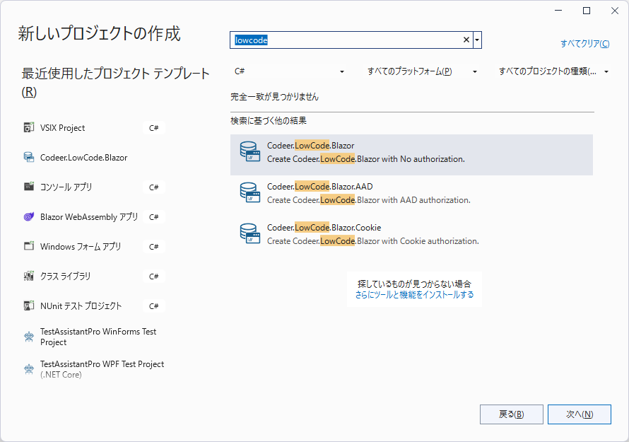 Codeer.LowCode.Blazor.TemplatesCodeer.LowCode.Blazor is a library designed to integrate execution engine-type low-code features into your Blazor app. It allows for the rapid creation of most functionalities using no-code/low-code, while specialized features can be crafted with the same level of detail as full-scratch professional coding. As a result, it is possible to develop satisfactory applications quickly and at a low cost. Users can customize the application themselves after its release. Please see here for how to use Codeer.LowCode.Blazor. Notice Regarding the Use of NuGet PackagesThis extension creates new projects that include references to various NuGet packages. Please be aware that the use of these NuGet packages is subject to the terms and conditions of each package's license. It is your responsibility to review and comply with the license agreements of the included packages before using them in your projects. By proceeding to use these packages, you acknowledge and agree to adhere to each package's respective license. Failure to comply with these licenses may result in legal implications and violate the rights of the package authors and contributors. For more information on a specific package's license, please visit the NuGet Gallery or the package's project page. Getting StartedStep1Create Project.