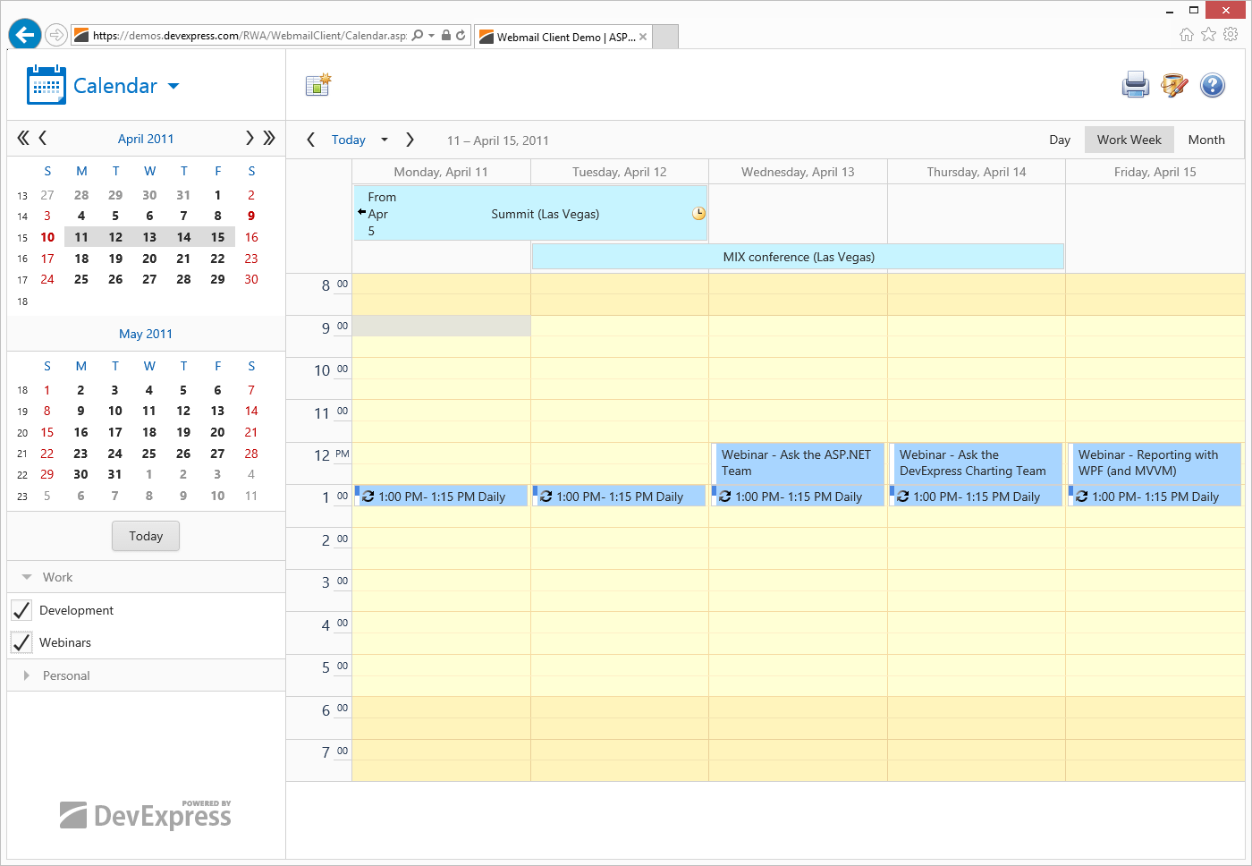 Replicate the look, feel and capabilities of Microsoft Outlook's Scheduler. The DevExpress ASP.NET Scheduler features day, week, month, and timeline views and includes built-in printing support.