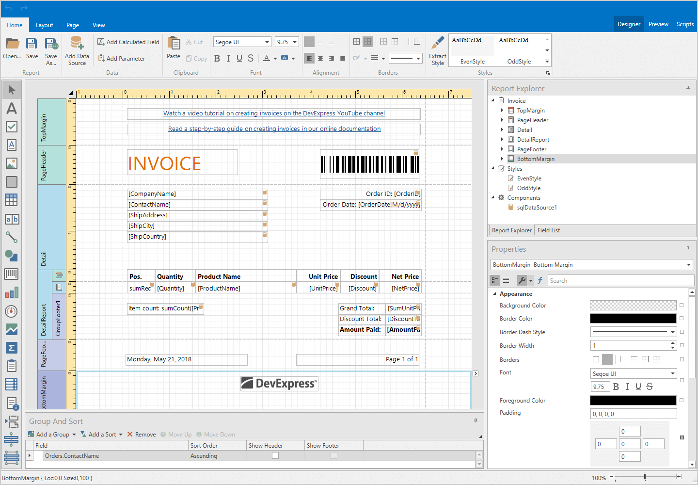 XtraReports is our next-generation Reporting platform for Windows® Forms, ASP.NET, WPF and Silverlight developers! XtraReports was engineered to help you create stunning reports for your end-users in the shortest possible time - yet maintain all the capabilities you've come to expect from today's most powerful reporting solutions. With full Microsoft® Visual Studio integration, XtraReports Suite allows you to build reports in the same exact way you build a typical Windows® Forms application. XtraReports uses the same code editor (C#, VB.NET or J#), the same Property Grid, the same component Toolbox, the same alignment toolbar, and ALL available Visual Studio IDE resources.