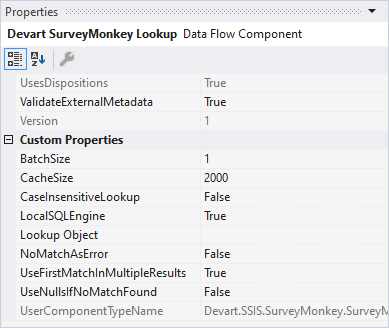 SSIS SurveyMonkey Lookup component offers very high performance because of the advanced optimization techniques used. It checks several rows at once, and caches the returned results to reduce the number of round-trips to the server. High-performance Devart SurveyMonkey Destination