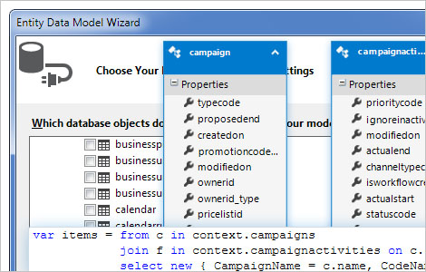 dotConnect for Dynamics CRM provides enhanced Entity Framework support for Dynamics CRM data with a bundled visual designer for ORM models with Visual Studio integration - Entity Developer. Standard Visual Studio Entity Data Model designer is also supported. Dynamics CRM Data Binding