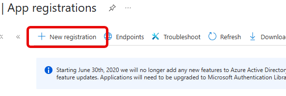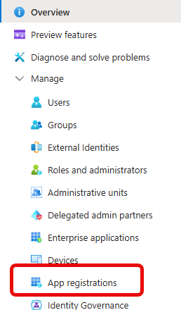 Other RequirementsAzure AD App RegistrationAn application registration must be made in Azure Entra. Go to https://portal.azure.com and go to Microsoft Entra ID (or on older Azure Portals, Azure Active Directory). Select App registrations from the menu: