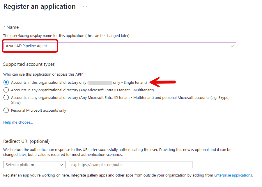 Provide a username that will make sense in your Entra environment. This user does not require a redirect or any other information. This should be a single tenant account as it should not be available anyplace else: