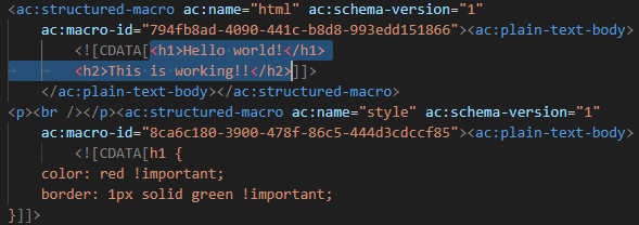 Suggested use: if there are customized macros you'd like to use, recommend creating the page in the confluence environment first and preconfiguring the macros there, then when you are ready to edit import that page in storage format. Make changes within the CDATA brackets to edit the contents of that macro.