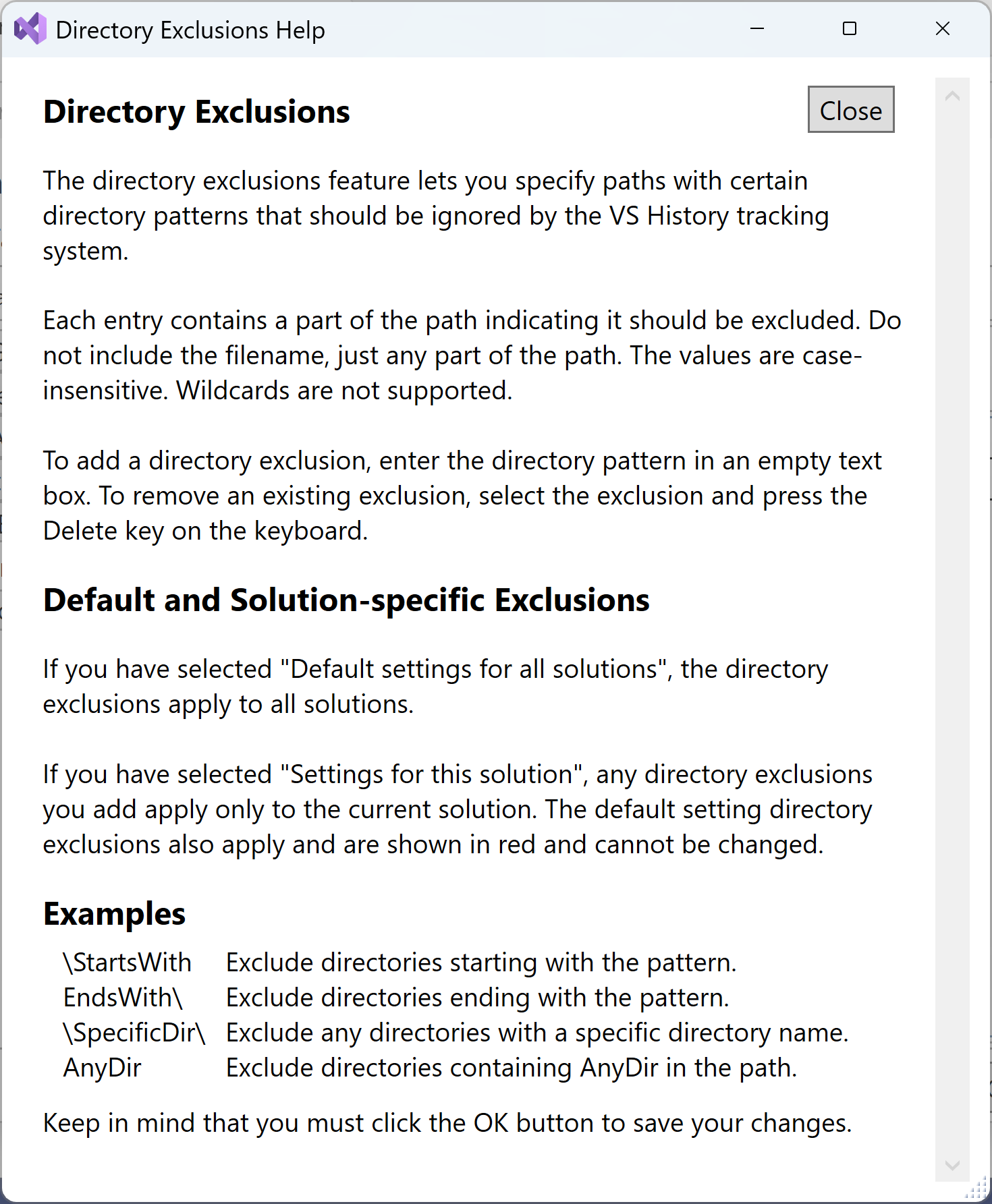 General patterns can be used to specify files and/or directories that should be excluded from VSHistory processing.