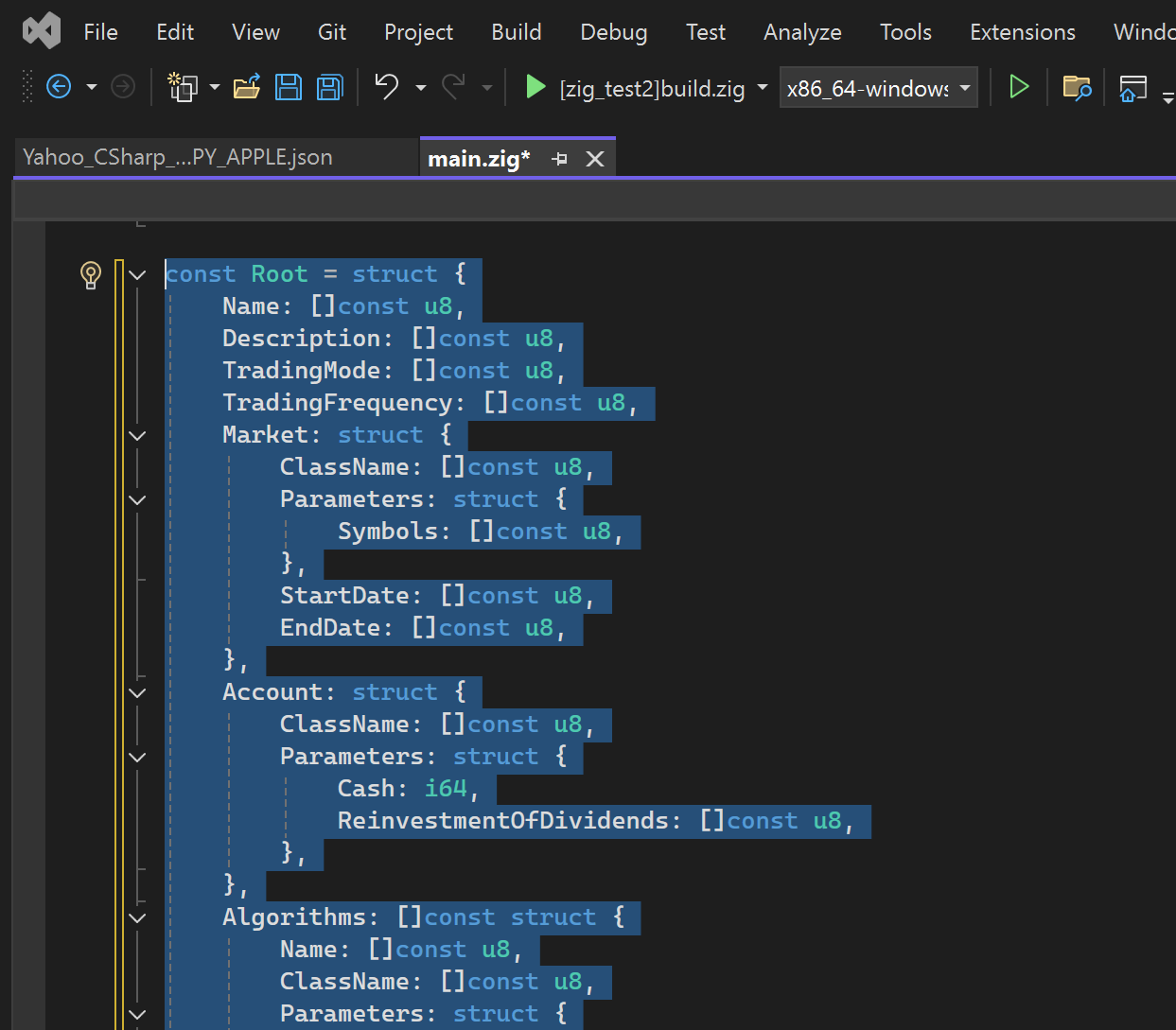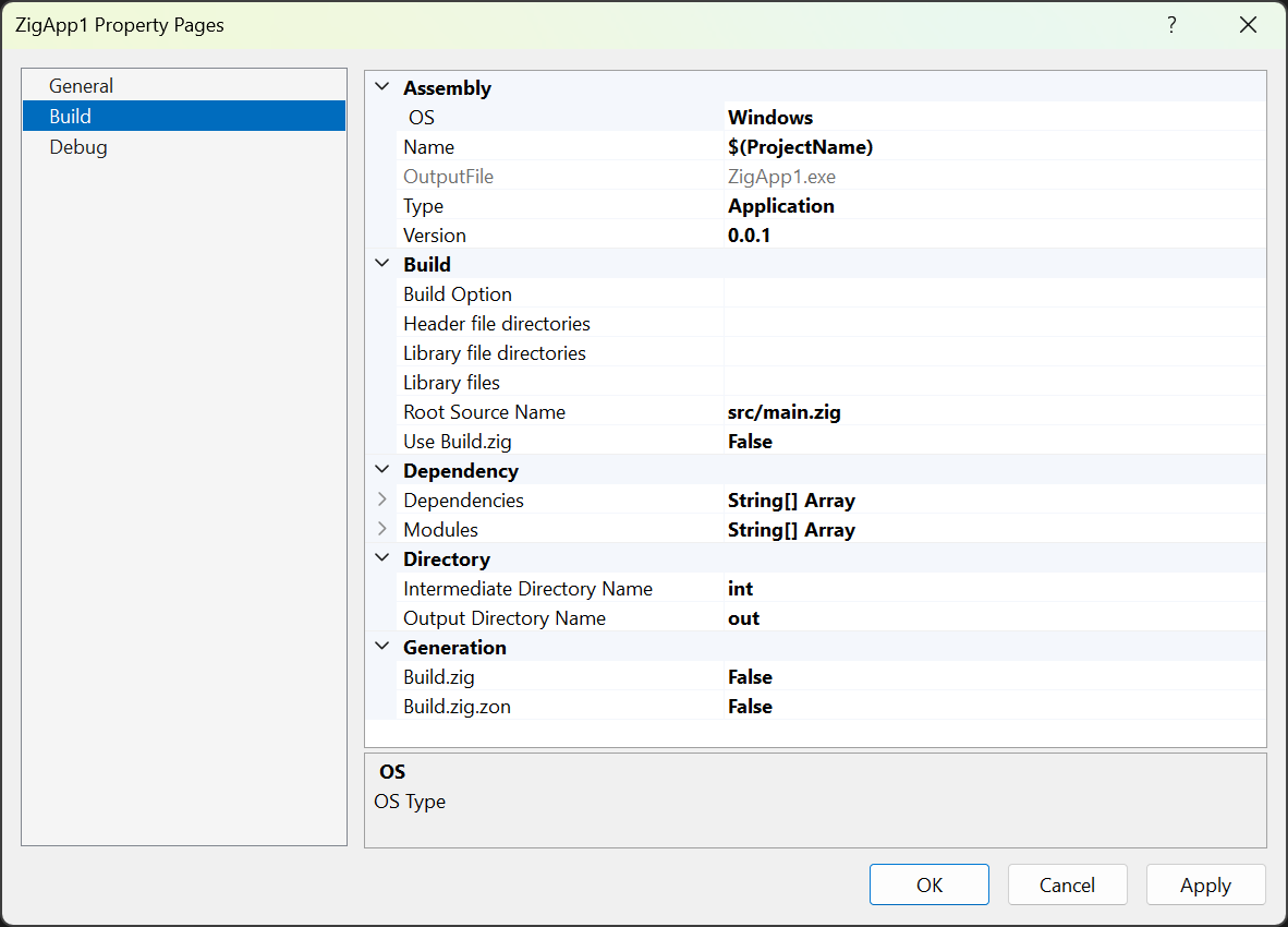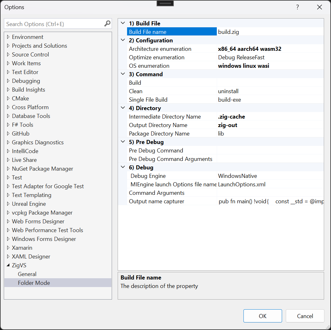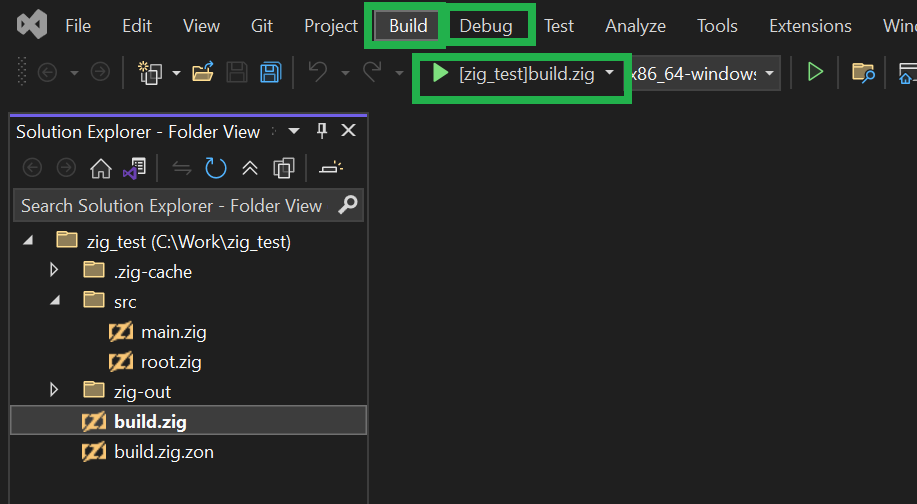 In ZigVS's Folder mode a build.zig file is used. As in Visual Studio Code, open a folder that contains build.zig and set build.zig as the build file. To change the build, edit build.zig. You can still create new packages, build, debug, perform performance profiling, and run tests via the GUI just like with other projects.
