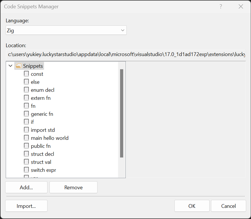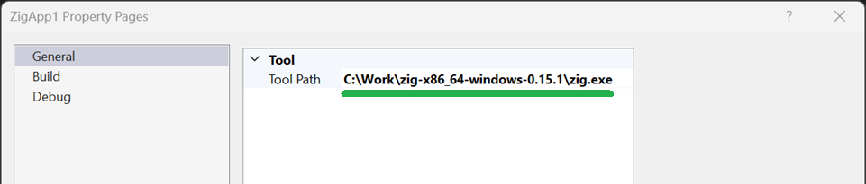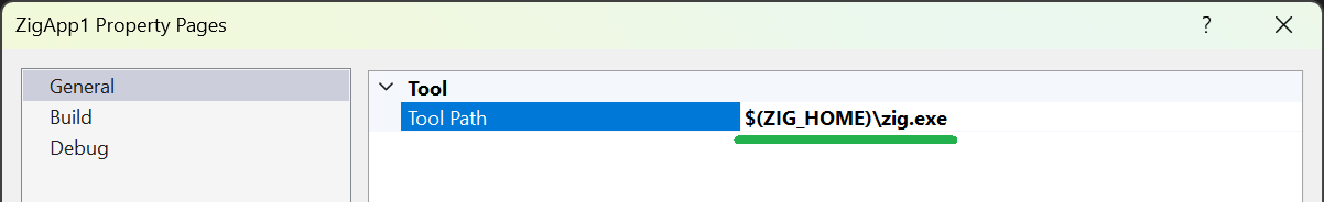 The path can either be an absolute path or it may contain Visual Studio macros or user defined environment variables. For example, if using an environment variable such as ZIG_HOME, then in [Tools] → [Options] or the Project Properties, set the path to zig.exe using that environment variable as $(ZIG_HOME)\zig.exe.