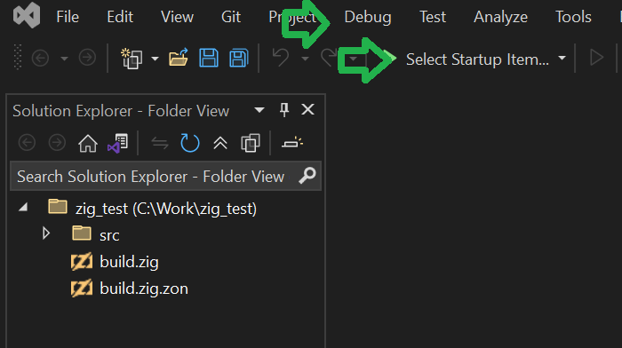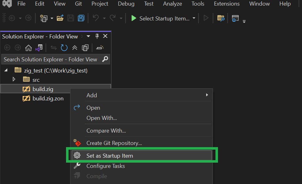 - Select build.zig with the mouse, right-click it, and choose [Set as Startup Item] from the context menu.
