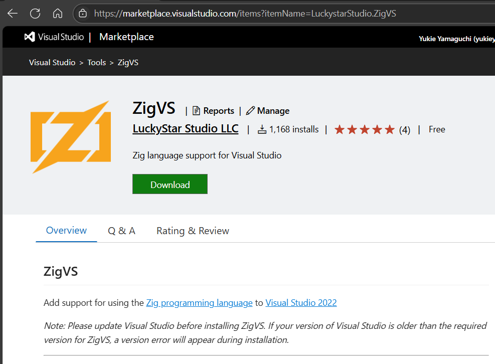 Note: Please update Visual Studio before installing ZigVS. If your version of Visual Studio is older than the required version for ZigVS, a version error will appear during installation.