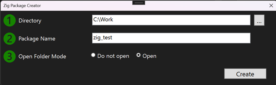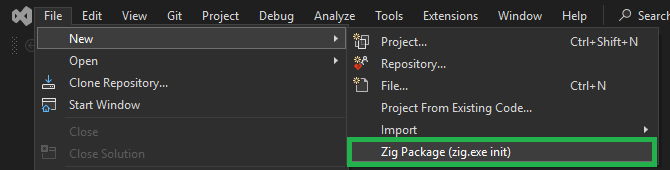 - Select [File] → [New] → [Zig Package (zig.exe init)]