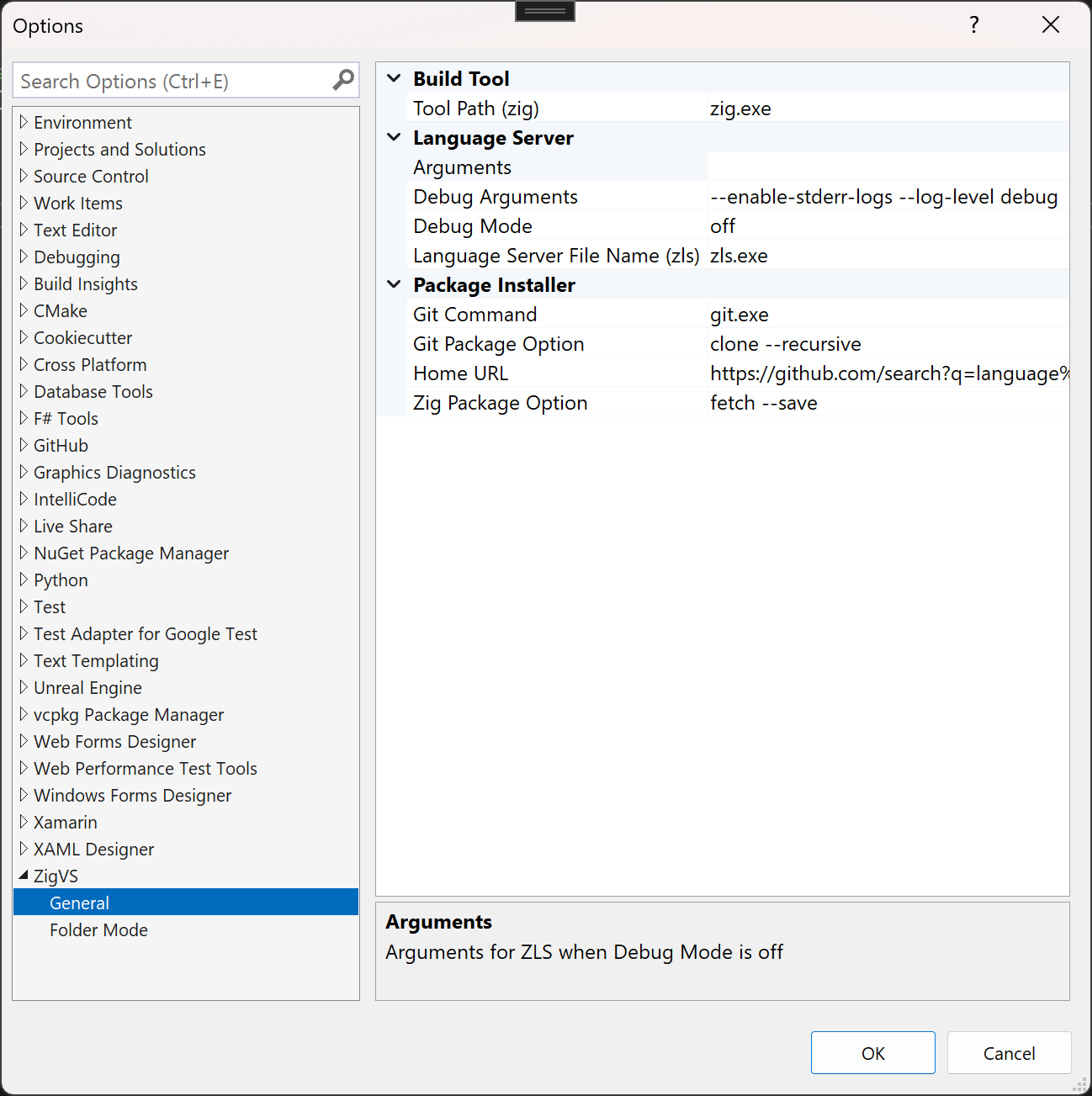 b. In Visual Studio enter the paths to zig.exe and zls.exe in the [Tools] → [Options] -> ZigVS properties editor (and in the Project's Properties dialog box if using Project Mode).