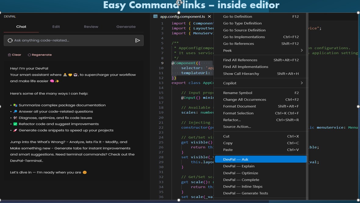 DevPal - AI Assistant & Code LabDevPal is a powerful AI-driven platform designed to help developers improve code quality, efficiency, and security. With DevPal, you can analyze, debug, refactor, test, and optimize your code effortlessly—all within your favorite editor. 🔌 No logins or signups required—just plug in your OpenAI API key and get started instantly. 🚀 Features🔬 Analyze and Debug