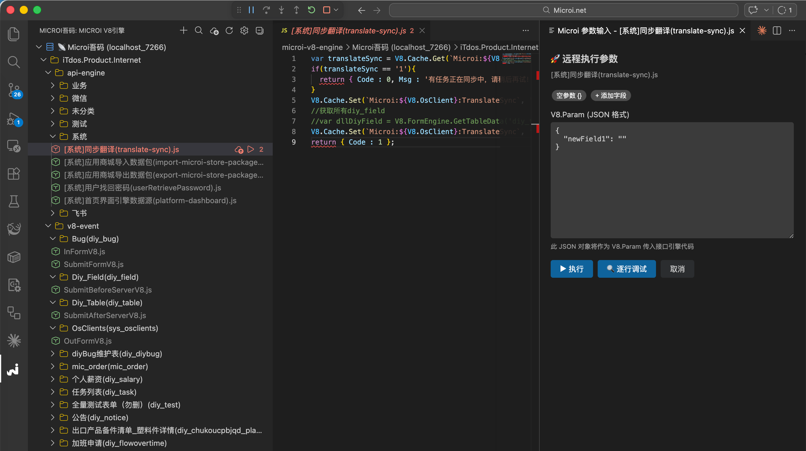 右键编辑器 → Microi: 远程逐行调试当前接口引擎