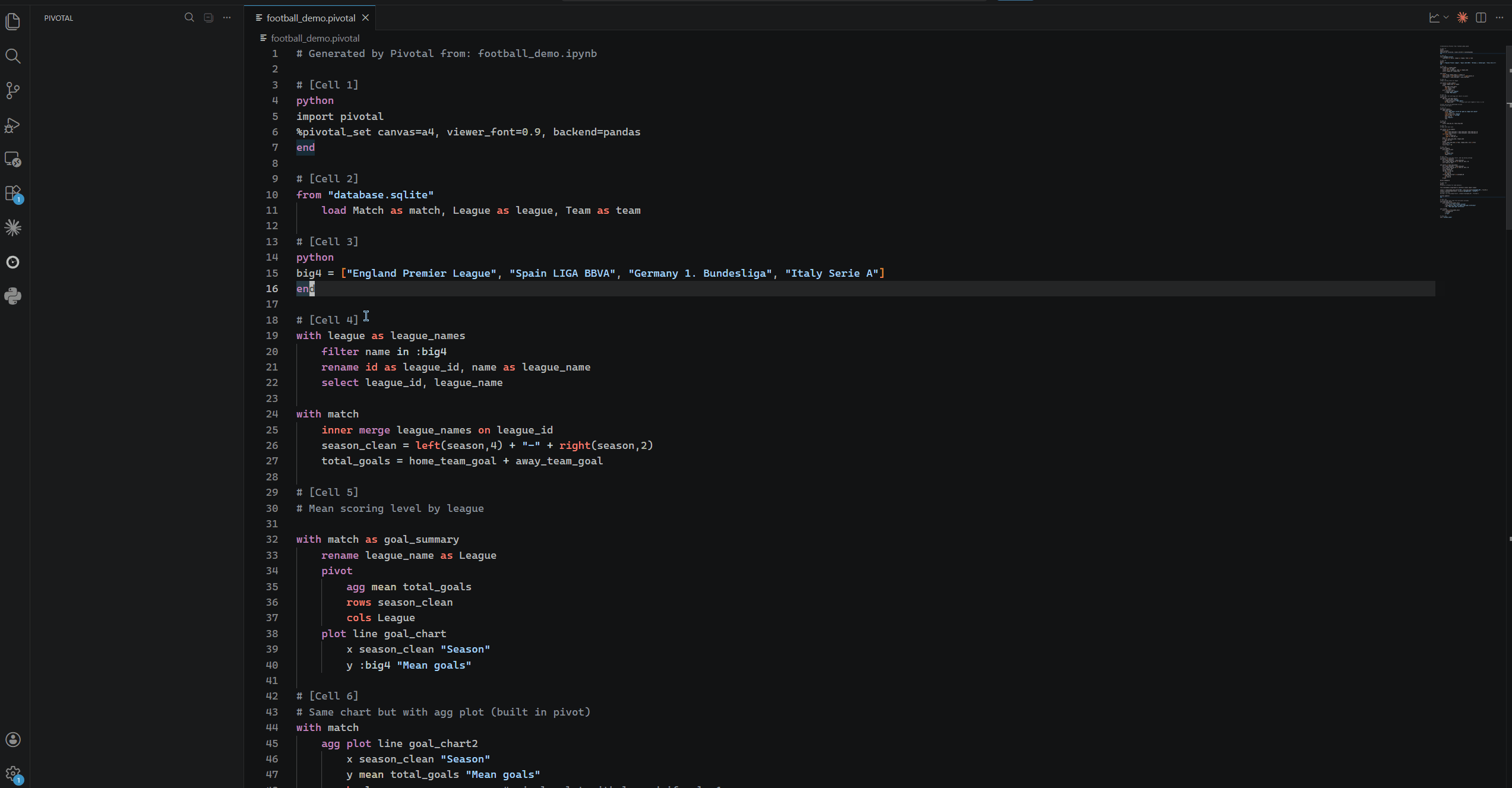 Syntax highlighting, autocomplete, interactive execution, and a live data viewer for the Pivotal data analysis language — a concise, readable DSL that compiles to Pandas, Polars, or DuckDB.