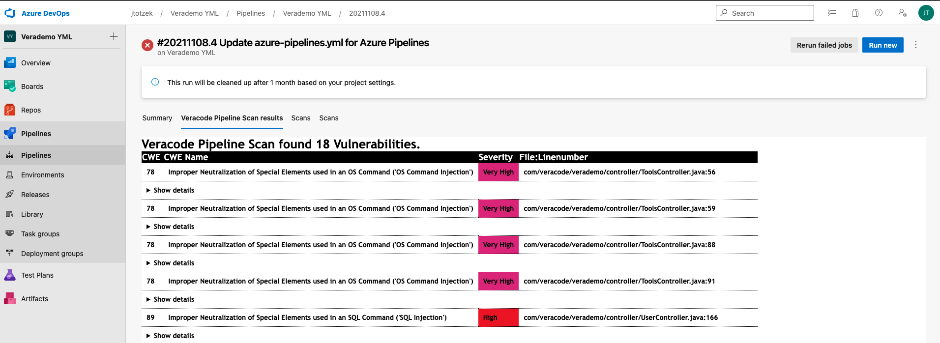 Azure Devops Extension - Veracode Pipeline ScanThis plugin should make it easier to run the Veracode pipeline scan on Azure DevOps pipelines. The full scan jar is included within the plugin and don't need to be downaloded each time when the pipeline runs. Please reference the Veracode Help Ceneter for further information. The Veracode pipeline scan is desgined as a fast feedback tool for developers and will not exchange the Veracode Sandbox or Policy scan for static analysis ATTENTIONThis is a community plugin and NOT officially supported by Veracode. Additional documentation and source code can be found at https://github.com/julz0815/ADO-Veracode-Pipeline-Scan-Plugin Usage:1. Install the below extension in your Azure devops org:The plugin can be found on Microsofts official marketplace. https://marketplace.visualstudio.com/items?itemName=JulianTotzek-Hallhuber.VeracodePipelineScan 2. Run Pipeline Scan in your azure pipeline.The mandatory parameters to configure are