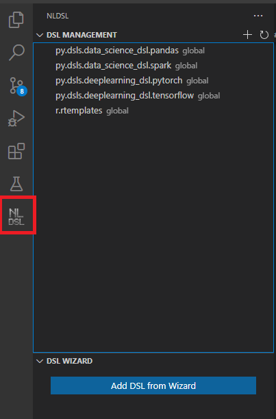 You can also import an existing DSL (e.g. created by another user) into the NLDSL extension by clicking the + button in the top right corner of the NLDSL sidebar. Make sure to follow the instructions of the wizard.