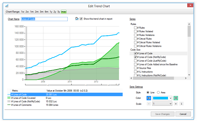 Monitor trending and evolution with NDepend: Visualize the team progress through most relevant code metrics printed on interactive trend charts.