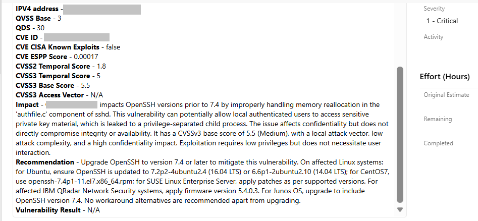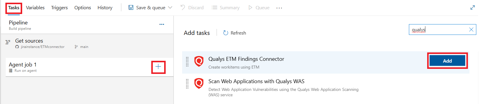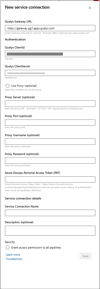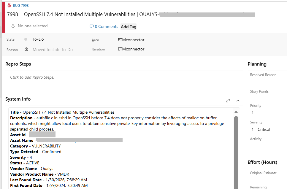 Working & BehaviourThe Enterprise TruRisk Management (ETM) extension enables seamless integration between ETM and Azure DevOps by automatically exporting and updating security findings from ETM into Azure DevOps as work items. ETM acts as the single source of truth for vulnerability data, ensuring that any changes to findings in ETM are always reflected in Azure DevOps.By keeping findings up to date as work items, development and security teams can manage vulnerabilities within their familiar Azure DevOps workflows, prioritize fixes, and align remediation efforts with sprint and release management. This extension supports cloud-based Azure DevOps setups and provides a reliable, one-way flow of data from ETM to Azure DevOps. Add "Qualys ETM Findings Connector" task to pipelineInstall the Qualys ETM Findings Connector extension into your Visual Studio Team Services account and search for the task in the available tasks. The task will also appear in the Utility section of the task list. Add it to your build pipeline. Task ConfigurationQualys Configuration using Service Connection Create a new service connection to connect to the Qualys Gateway server. You need to provide the Qualys API Gateway URL, Qualys ClientID , Qualys ClientSecret and Azure DevOps Personal Access Token (PAT). If your Azure DevOps instance does not have direct Internet access and a proxy is required, click the "Use Proxy Settings" check box, and enter the required information. Configure Filters to get specific Findings- Asset QQL: You can configure the asset-level query here and multiple assets can be configure using a comma-separated format (for example: asset.assetID=12345,34563). If the query is not configured, it will pull detections for all assets. Finding QQL: Finding QQL is a required field. At least one QQL must be configured to detect findings(For example: Finding.qds>50) View Work ItemsTo view the work items/ ticket details, select the work item under Board Section. The Qualys ETM Findings connector automatically creates, or updates work items in Azure DevOps based on Detection from Qualys. As part of this process, it maps specific fields from Qualys such as Finding ID, AssetID, severity, category, CVE ID, QDS score., Asset information, and detection details into the Azure DevOps work item. View Work Item details- Release Notesv1.0.0 -First version of the extension. Reference - User Guide |