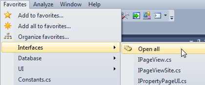 In addition to the Favorites menu, you can access favorites from the Favorite Documents tool window. Solution-specific favorites are separate for each of your solutions and stored next to the solution file, global favorites works for all solutions. You can create links to folders, projects and other items in Solution Explorer, create links to folders in Source Control Explorer and you can create links to solutions. Visit the Favorite Documents home page for more information. See What's New. Find more Visual Studio extensions at the Vlasov Studio site. |