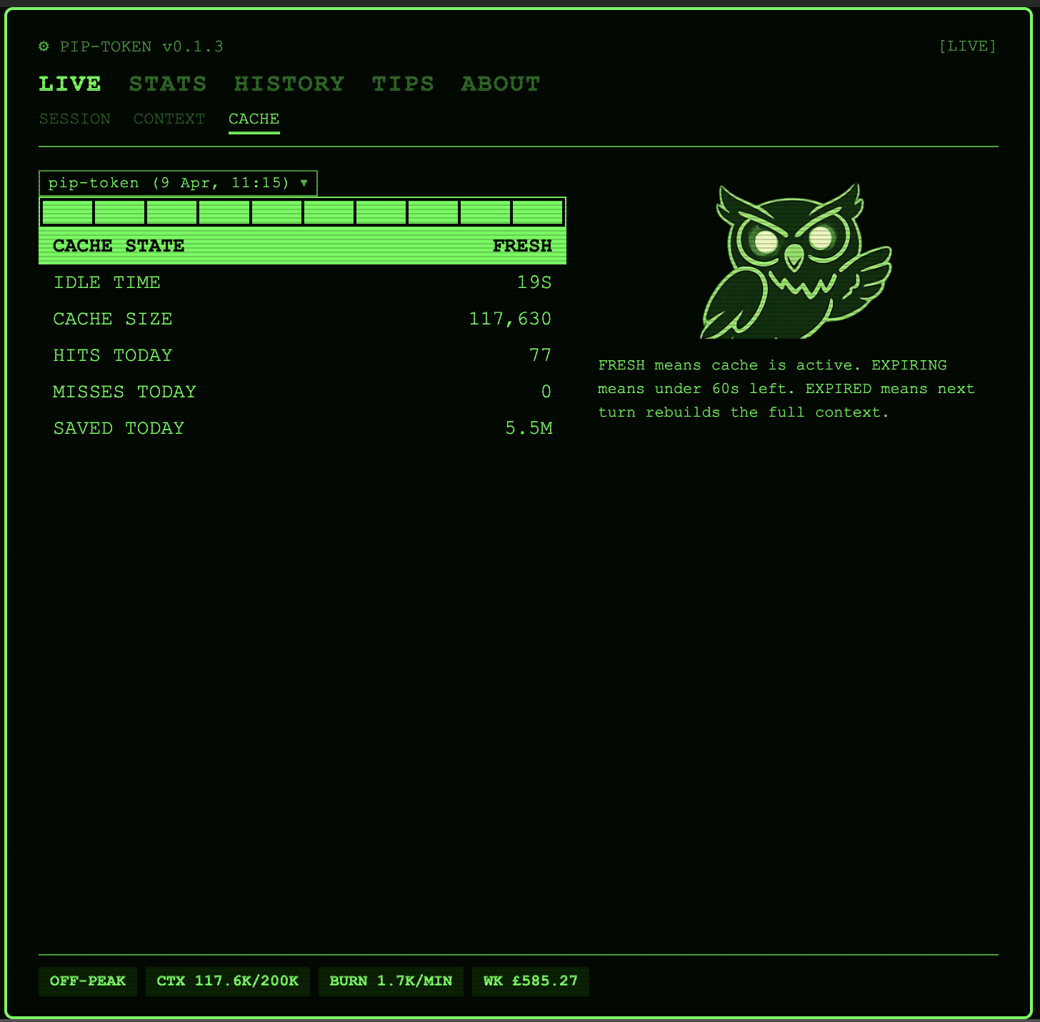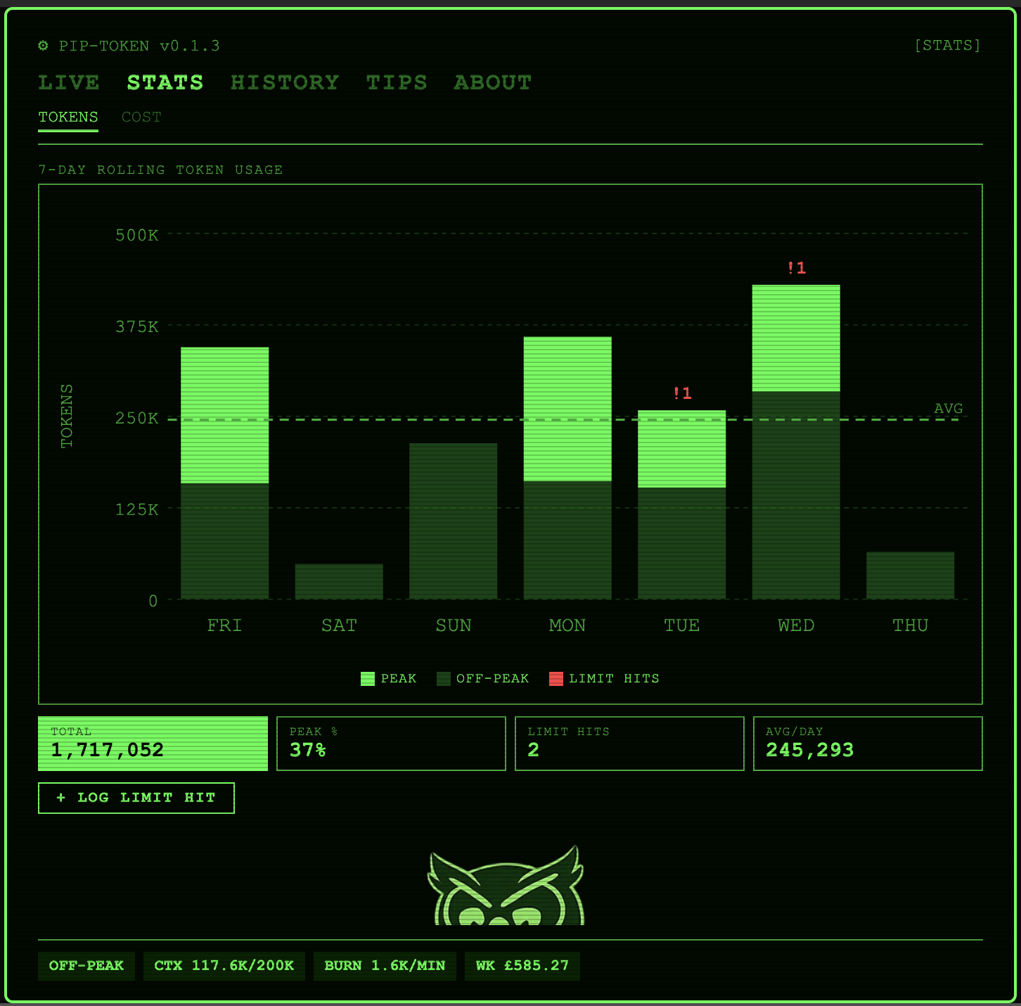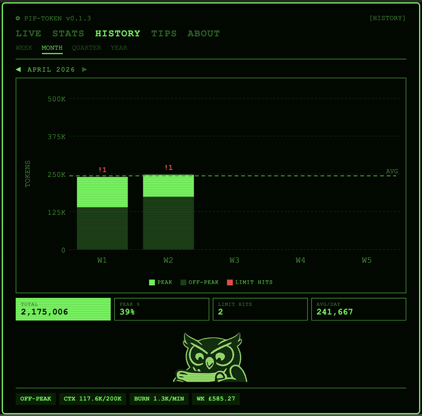 Pip-Token gives Claude Code users visibility into token consumption, peak vs off-peak usage, cache hygiene, and historical trends.