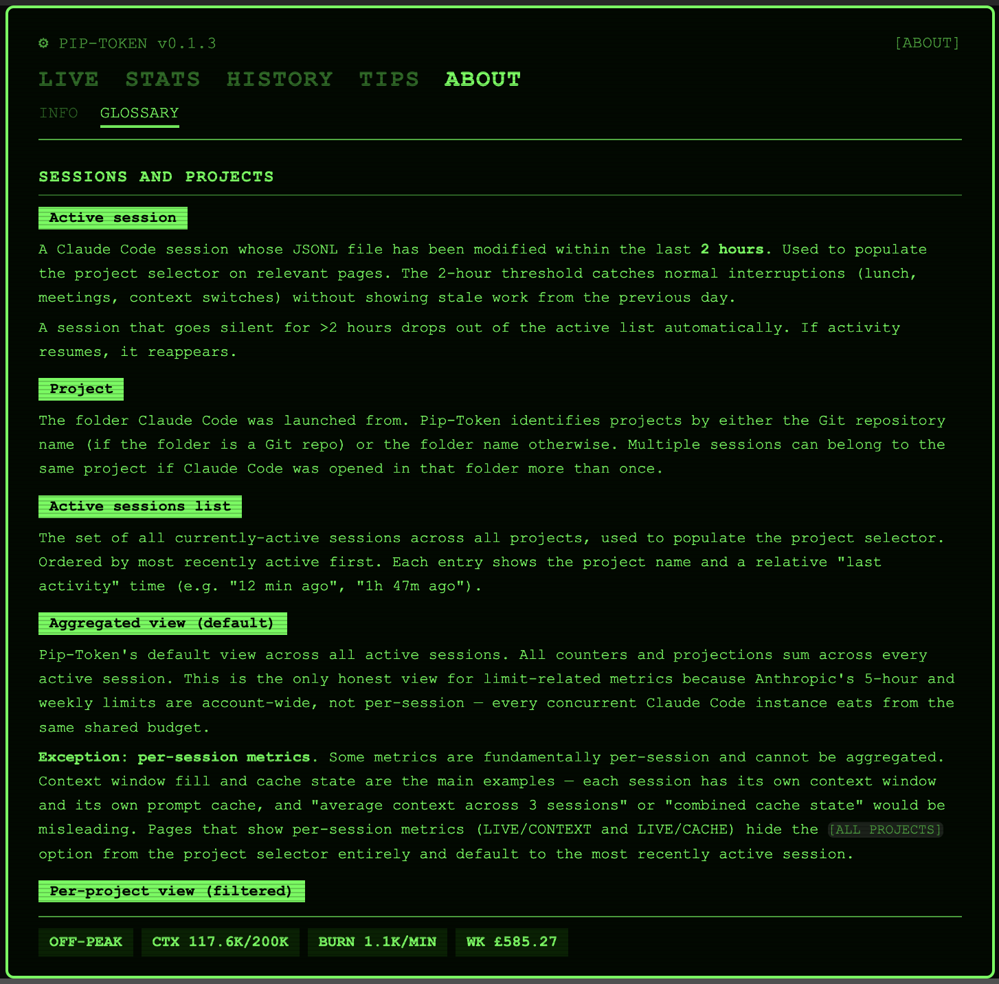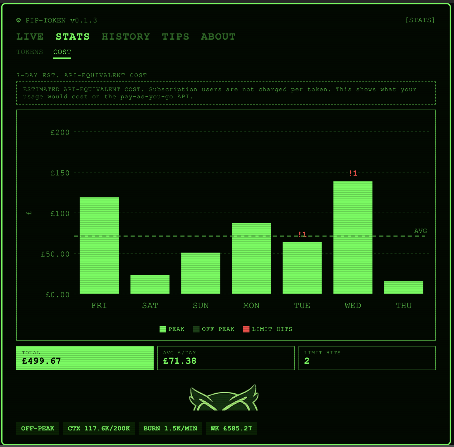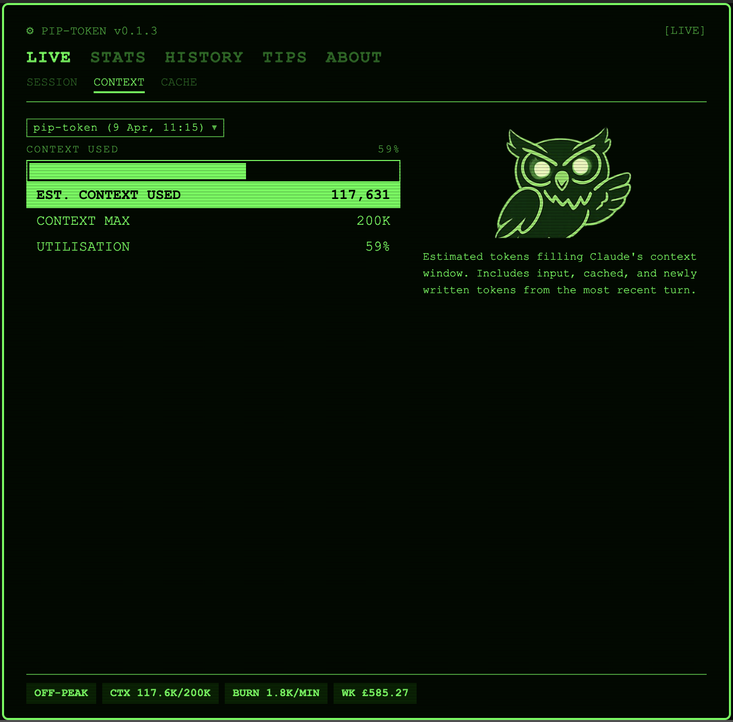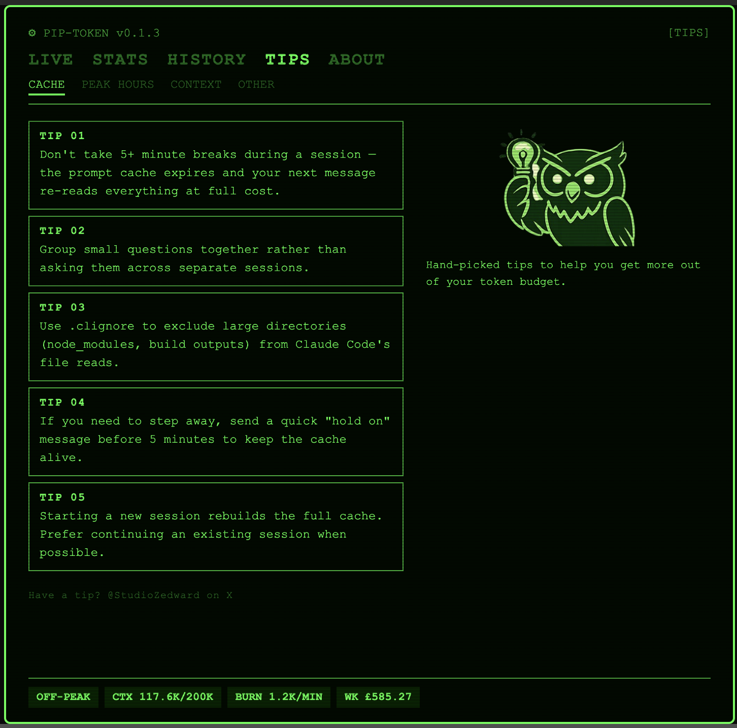 Pip-Token gives Claude Code users visibility into token consumption, peak vs off-peak usage, cache hygiene, and historical trends.