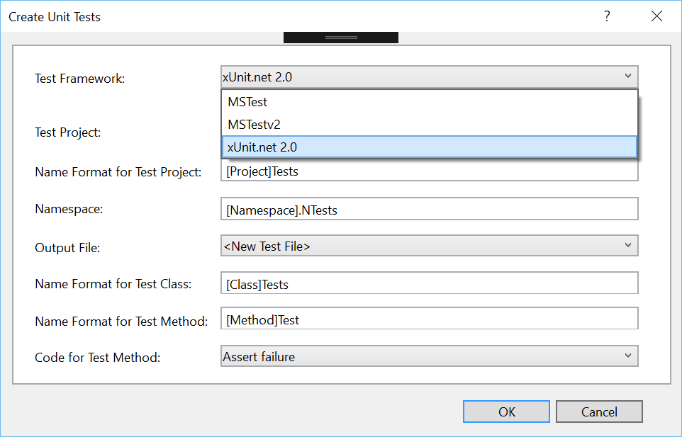 For Visual Studio 2022,please use https://marketplace.visualstudio.com/items?itemName=YowkoTsai.xunitnettestgenerator2022xUnit.net 2.0 Test Generator For Visual Studio 2017 and Visual Studio 2019This is an extension for Visual Studio 2017 and Visual Studio 2019 that extends the test functionality to allow you to create unit tests. It works for Visual Studio 2017 and Visual Studio 2019. The extension extends the built-in test generator functionality allowing developers to generate tests using xUnit.net 2.0. You can create xUnit.net 2.0 test project from Please note that it doesn't support IntelliTest yet. 2024/03/10 update: upgrade xunit to 2.6.6 and xunit.runner.visualstudio to 2.5.72019/09/26 update: use xunit 2.4.1 and xunit.runner.visualstudio 2.4.1 to fix value is null.