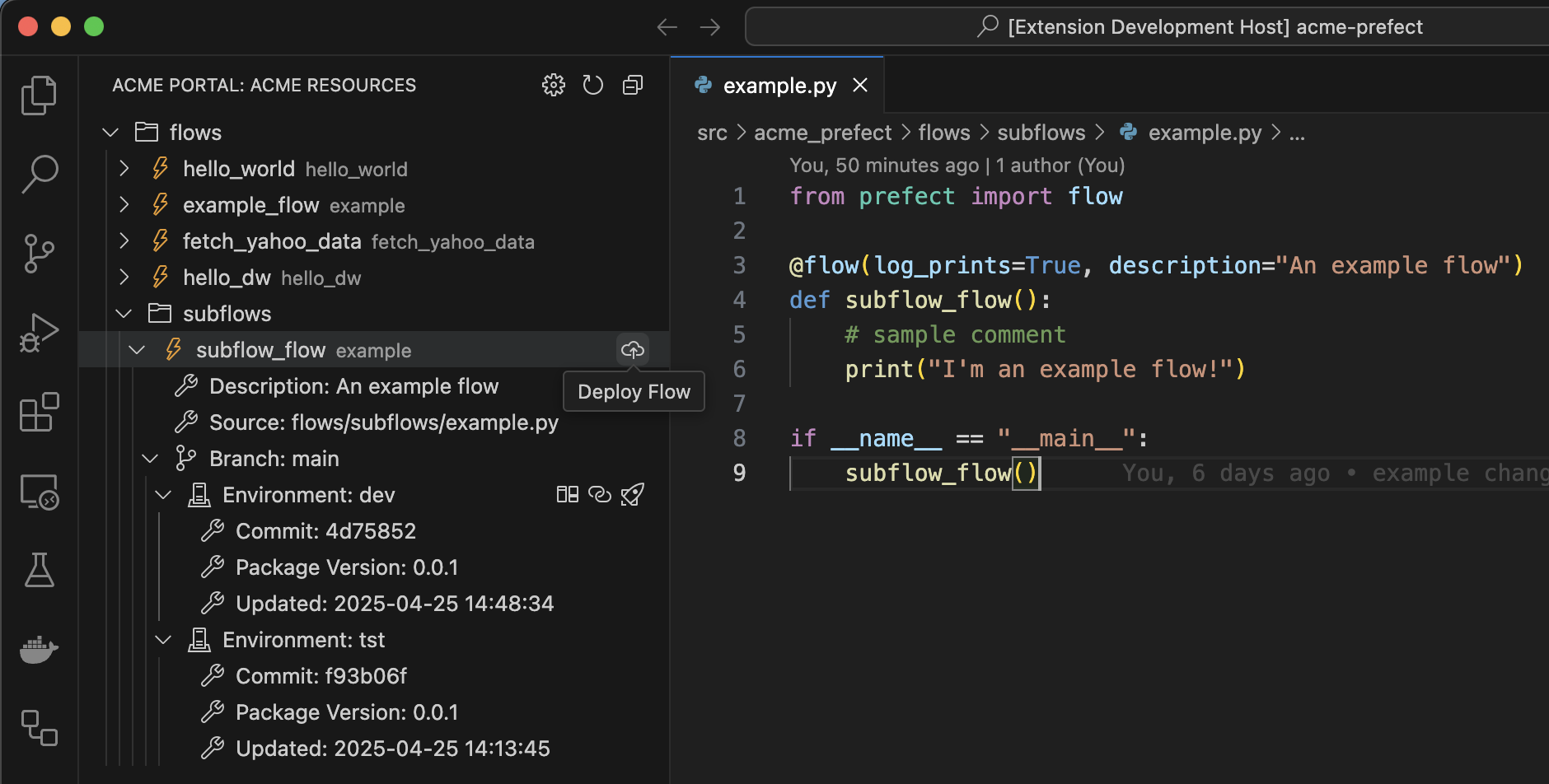 This project is a VSCode extension that allows users to manage deployments of their python projects. Data for the extension is provided via the open project using acme-portal-sdk. Sample project using it is available at acme-prefect.