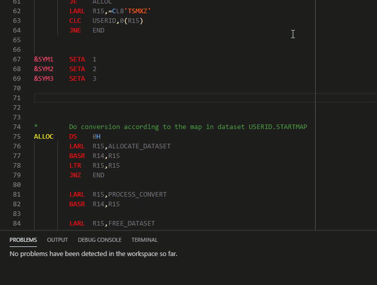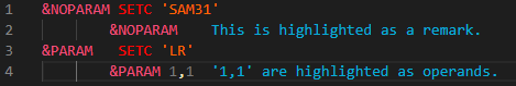 The HLASM Language Support extension highlights statements with different colors for labels, instructions, operands, remarks and variables. Statements containing instructions that can have operands are highlighted differently to statements that do not expect operands. Code that is skipped by branching AIF, AGO or conditional assembly is not colored.