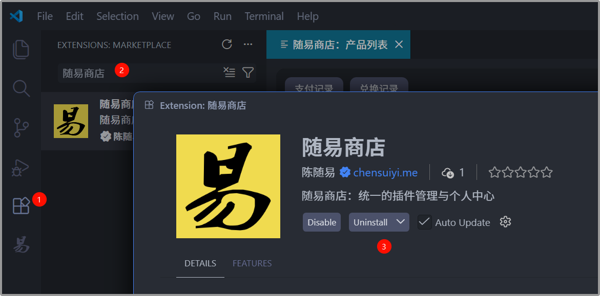 点击(1)处的扩展图标,在(2)处输入随易商店,点击打开,然后点击(3)处安装即可。