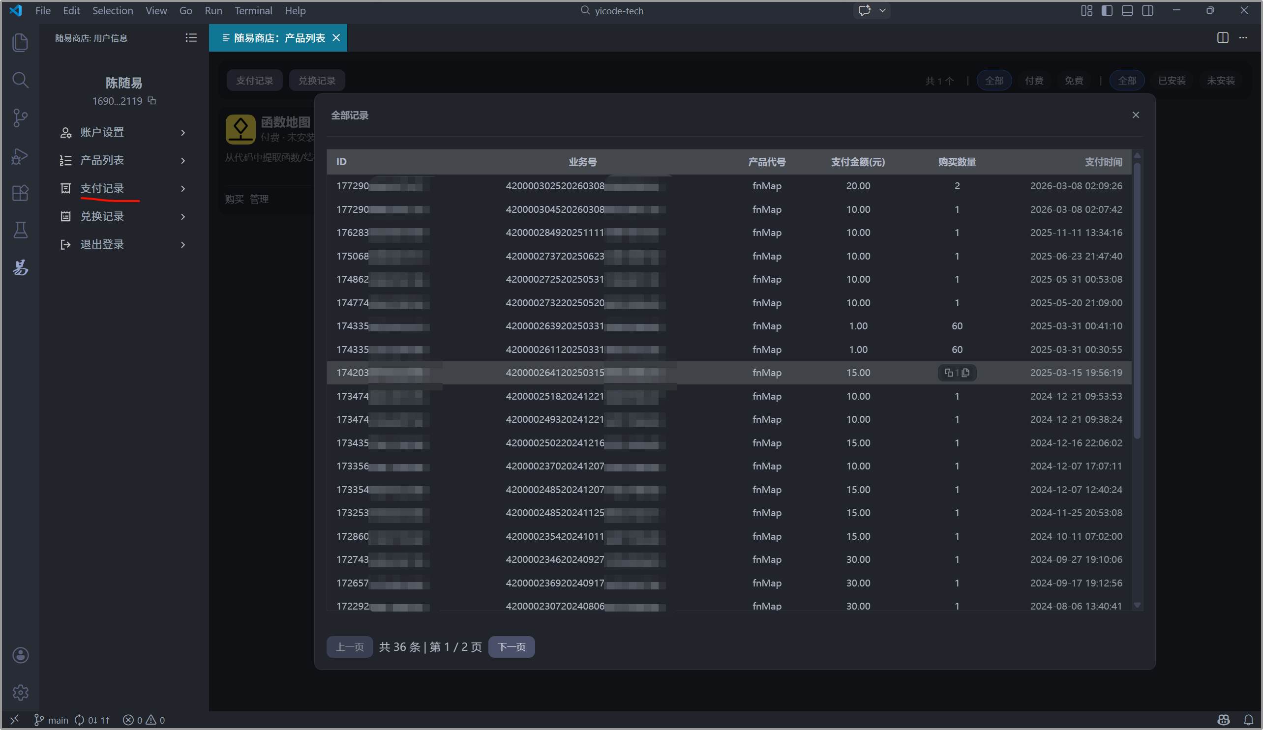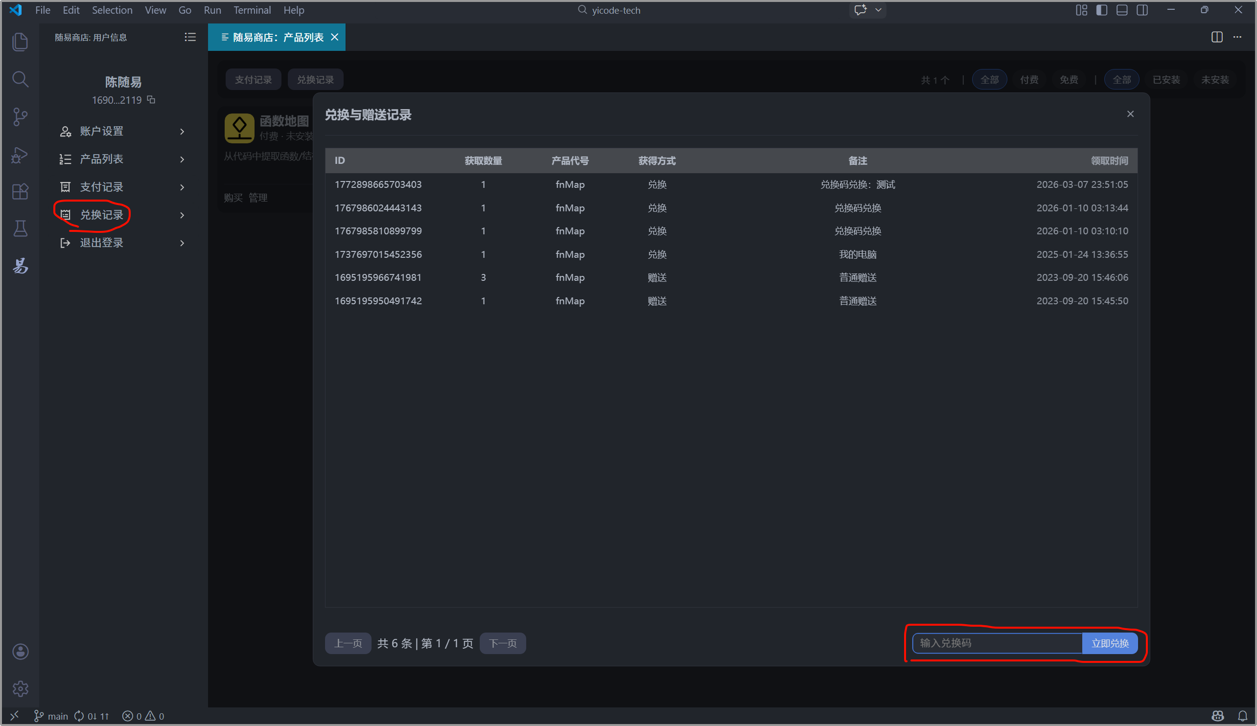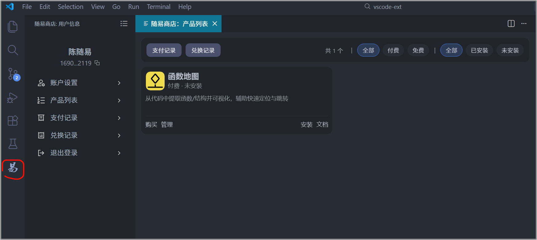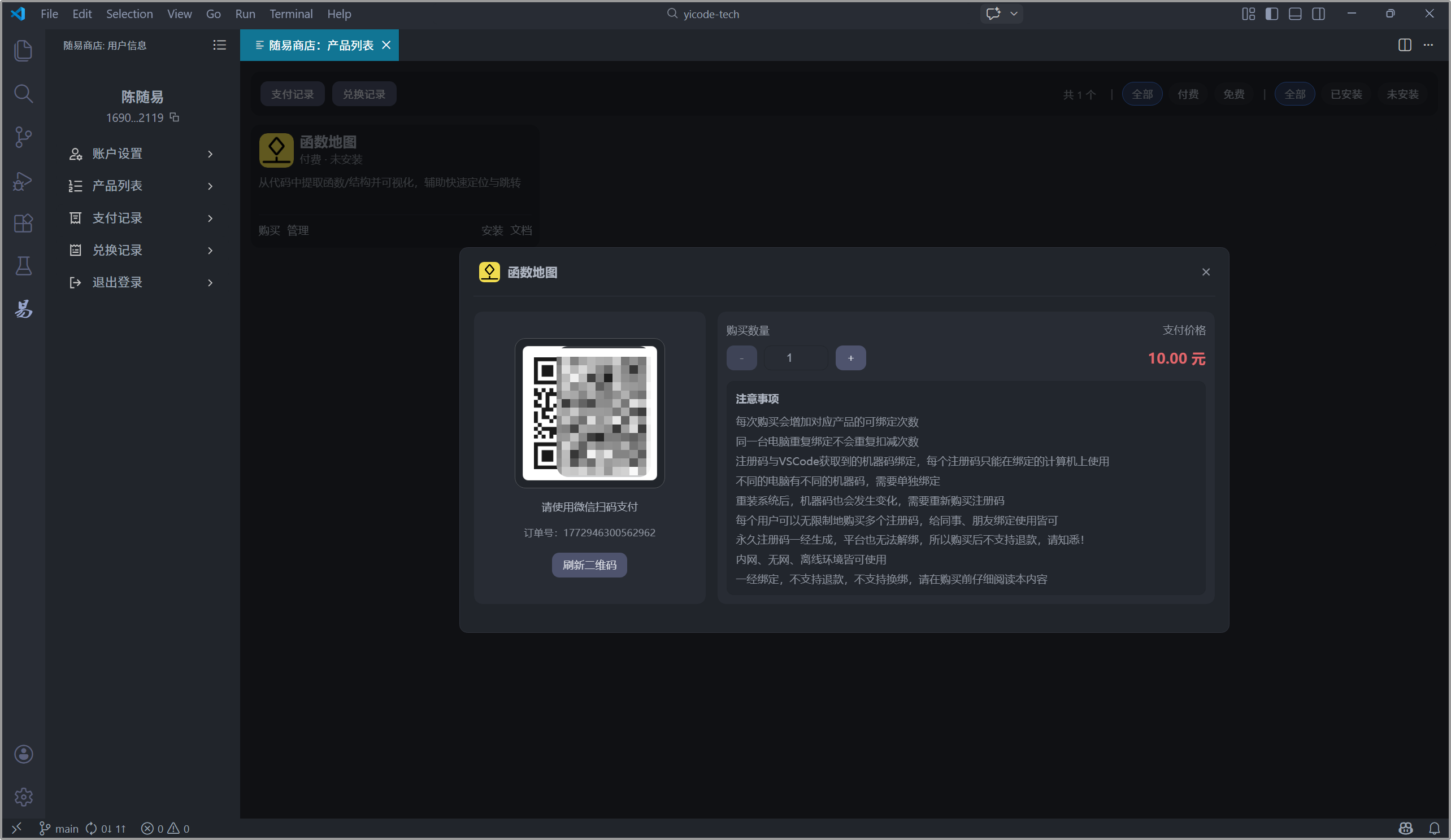 随易商店中所有付费扩展均通过VSCode内置的API获取对应的机器码,通过这个机器码,请求在线接口,生成与之绑定的注册码,将注册码放到对应扩展的配置中,该扩展就可以使用了。