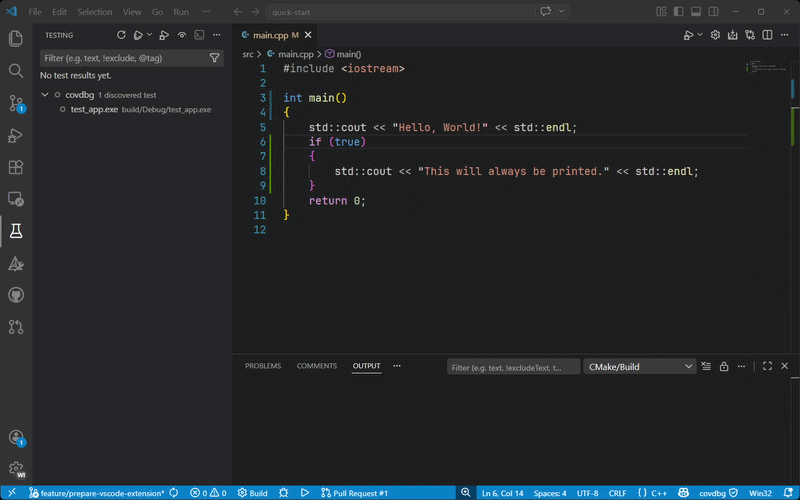 Run your executables with coverage, inspect covered and uncovered lines in the editor, open a detailed report, and rerun discovered test binaries from the Testing view. The extension bundles the covdbg runtime for a smoother setup on Windows.