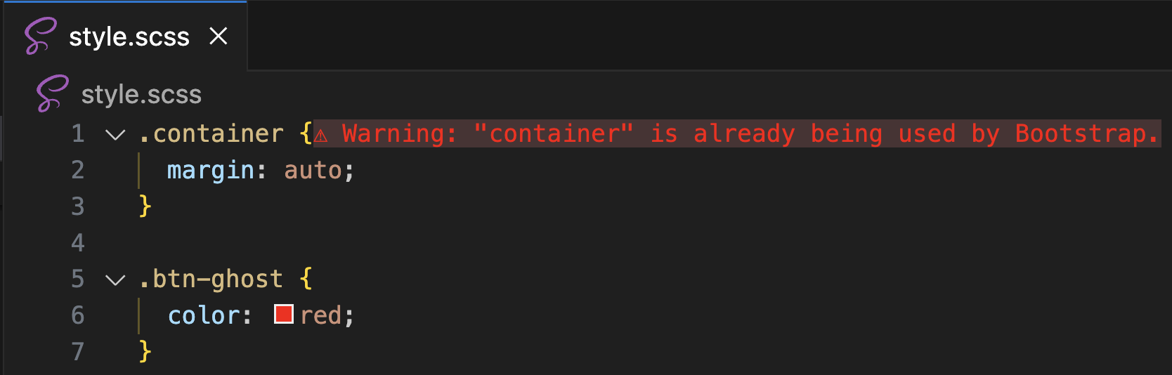 - ⚠️ Activation: Open the command pallete (Ctrl + Shift + P / Cmd Shift + P) and search for "Bootstrap Protector" and choose "Check SCSS for conflicts"