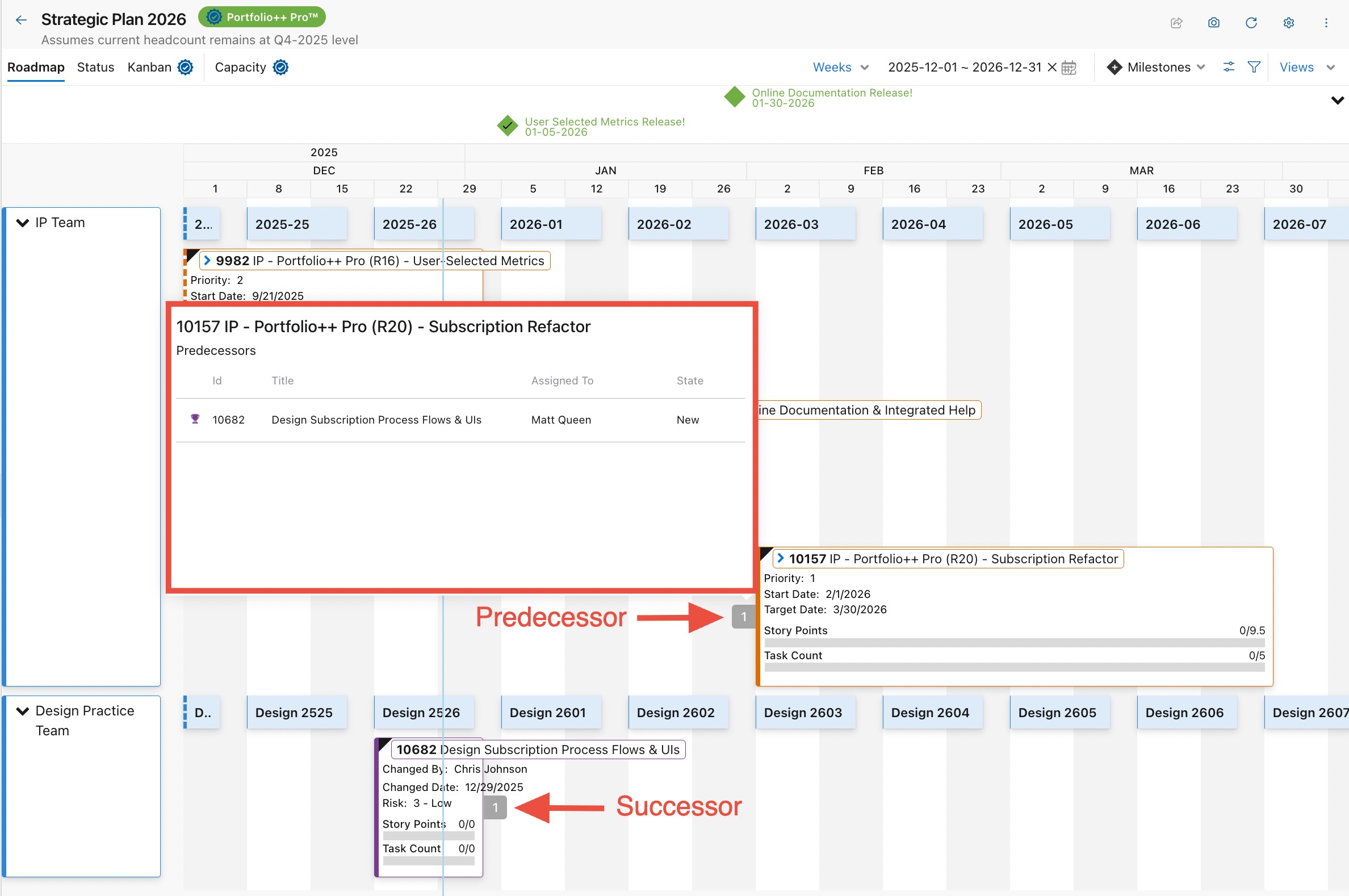Dependency Management in Portfolio++ Pro™ makes it easy to visualize and understand relationships between work items on Roadmaps. When enabled through the Show Dependencies option, dependencies based on predecessor and successor links are displayed directly on a Roadmap’s selected work-items.