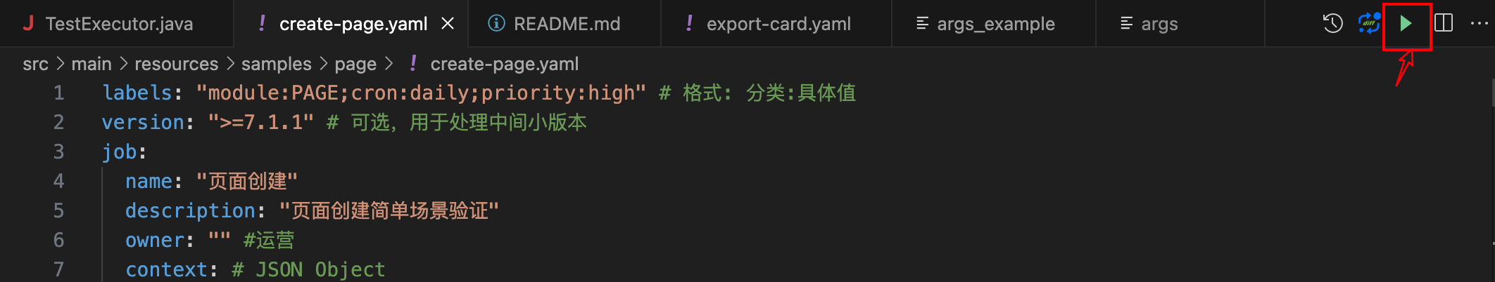 打开 YAML 文件时,点击标题栏的 ▶️ 按钮执行