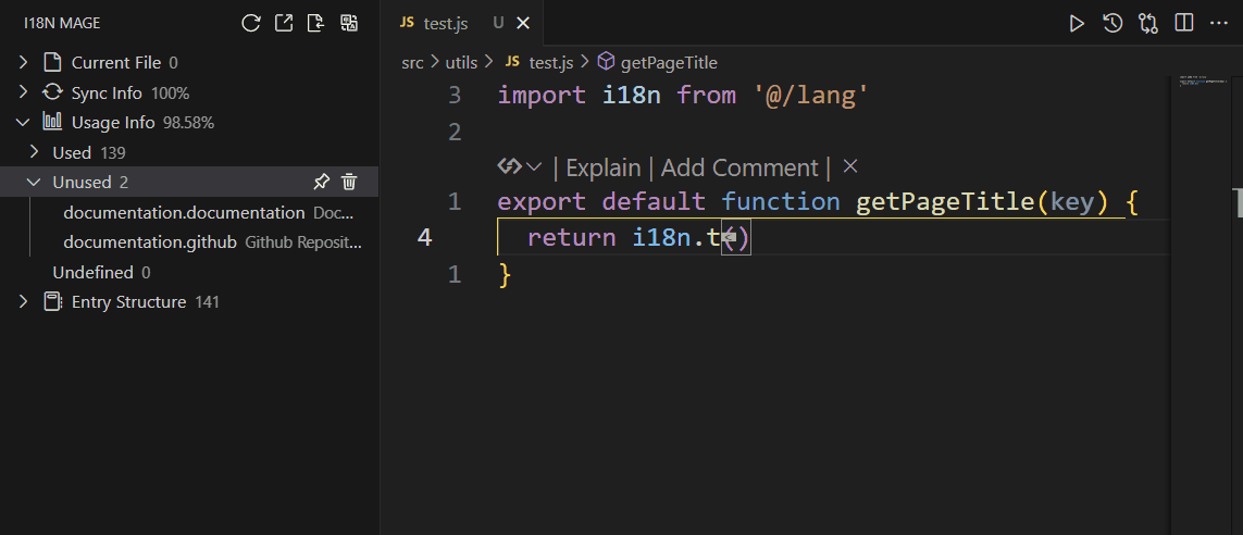 - Automatically suggests existing translation entries when typing internationalization functions (e.g.,