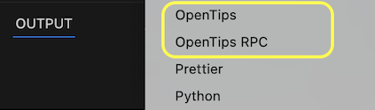 OpenTips provides output channels where you can see logs and debug information. You can access these output channels by looking for the Output tab in the bottom panel of the editor. You'll see two channels related to OpenTips: