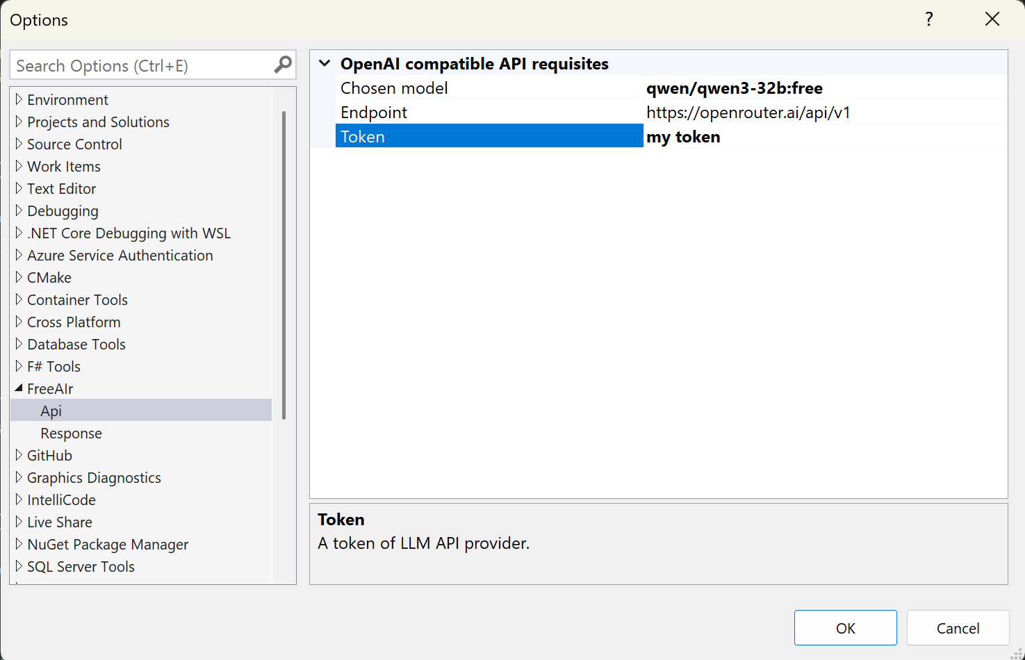 Visual Studio User-Specific SettingsThis is a group of user-specific settings. Each member of your team can customize these settings for themselves, they are saved only locally in the Visual Studio instance. For example, these are font size settings for the LLM dialog. They can be opened via FreeAIr JSON settingsThis is a group of settings that makes sense to keep common for all members of your team. These settings can be saved in a json file, which is recommended to be committed to the git repository. Also, these settings can be saved inside Visual Studio, if, for some reason, it is undesirable to create a file. These settings contain: