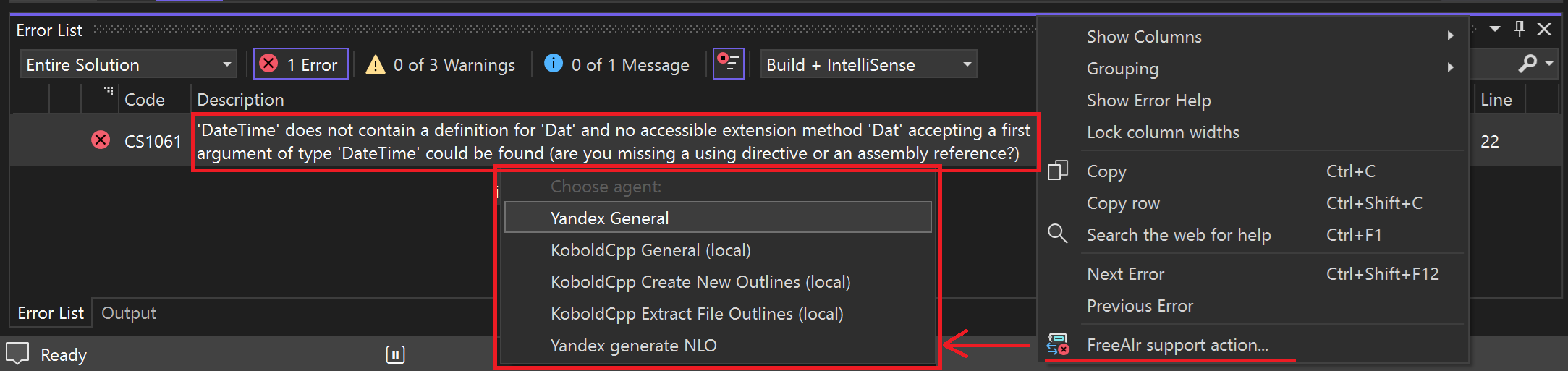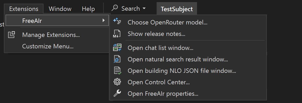 FreeAIr is a Visual Studio extension which allows you to interact with any LLM which have OpenAI-compatible API. Even with local LLM! No artificial || political barrier injected in FreeAIr code. QAQ: Wait, another one?! A: Yes, yet another LLM VSIX :) Q: Why? There is a fantastic Copilot! A: Because Copilot is a subject of politics. Today you are enjoying Copilot, tomorrow your country has been banned from it. FreeAIr is not a political subject and provides no artificial barriers. Q1: I have NO access to any LLM in Internet via public API. Q2: I have NO rights to use any remote LLM because of license of the code I'm writing. A: No problem! You can use local LLM, for example via KoboldCpp. Local LLM sends nothing to remote servers. See details below. FeaturesMain functions: