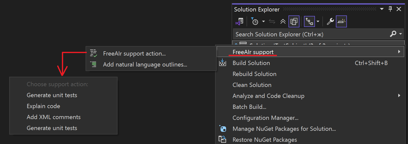 Since all project files are processed, searching can take a considerable amount of time. To speed it up, FreeAIr supports RAG using natural language outlines. Natural Language OutlinesNatural Language Outlines are a special kind of comments embedded directly into the source code. These comments are generated by LLM, and are used to create embeddings that are used in RAG. In FreeAIr, NLOs are implemented according to paper. Generating NLOThe first step is to generate NLOs and add them to the source code files. When starting this work, you should generate NLOs for the entire solution via this menu: