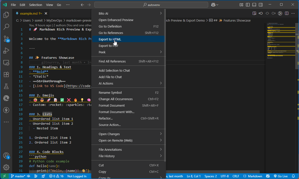 A powerful VS Code extension that brings GitHub-style Markdown previews and one-click PDF/HTML exports right into your editor—no more Pandoc hacks or context-switching.