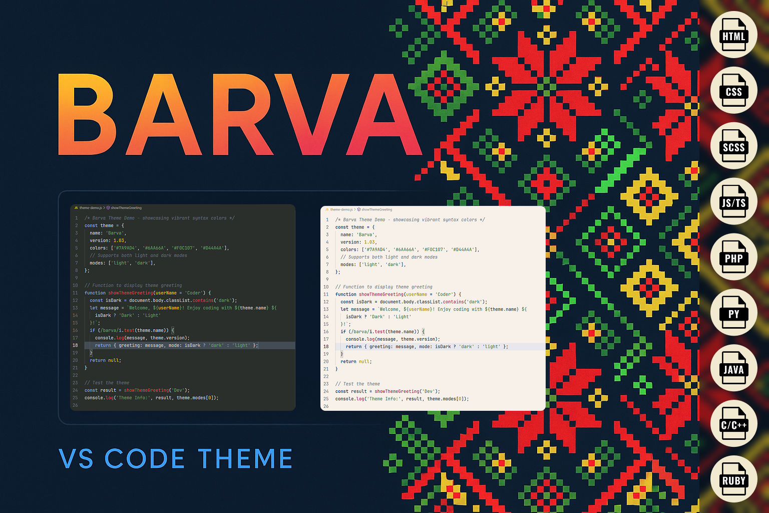 Barva Theme — a modern and soulful Visual Studio Code theme inspired by Ukrainian embroidery.