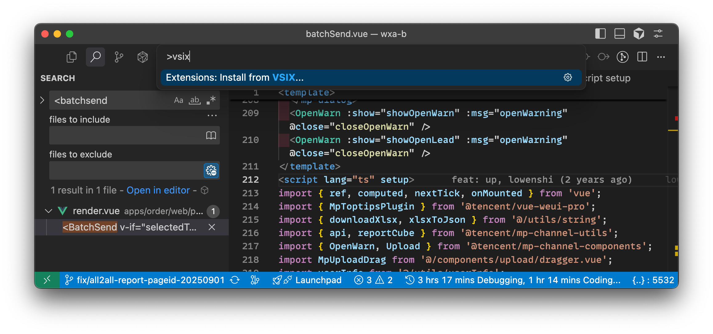 Command + Shift + P 拉起命令面板输入 vsix ,选择 Extensions: Install from vsix 然后选择 .vsix 文件即可