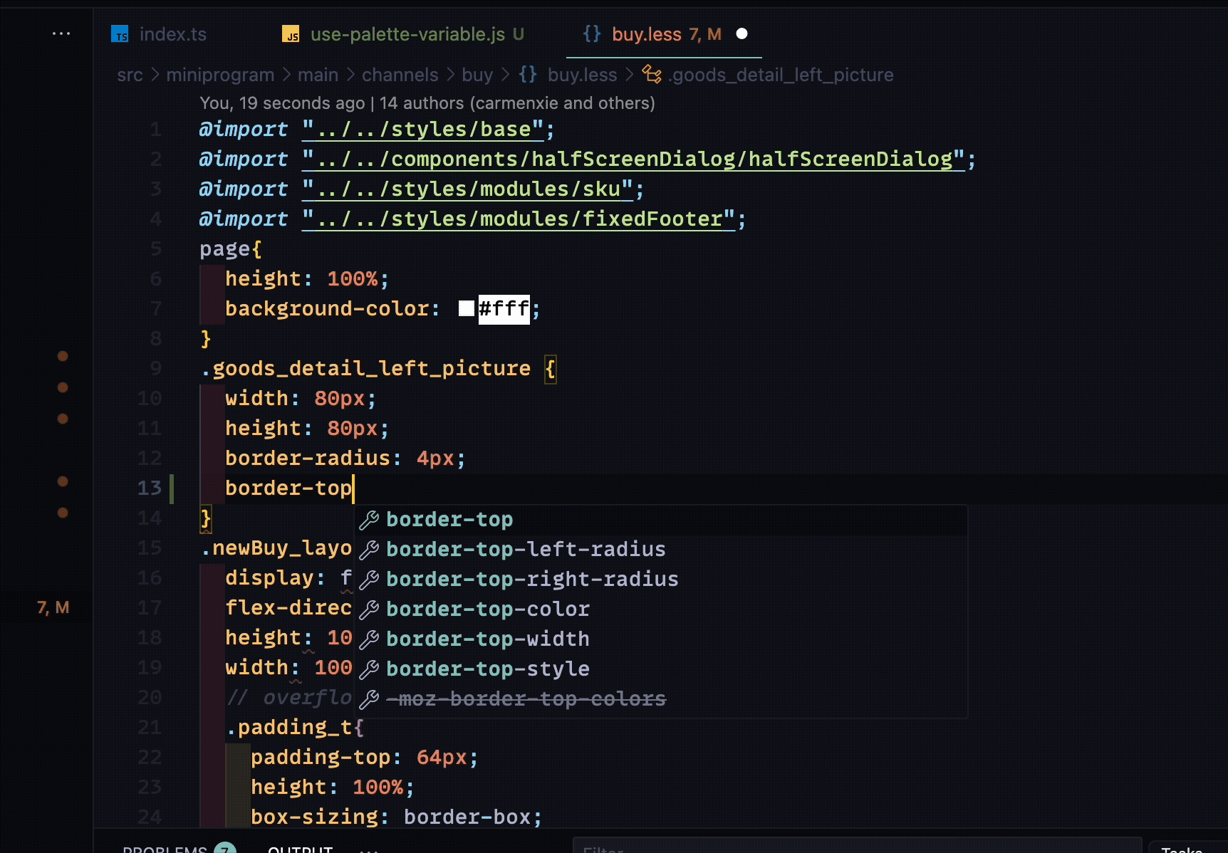 - 检测到输入 color/background-color 这类颜色属性时,在冒号后面提供已有色板的颜色补全(如果匹配到多个变量,会展示多个候选)