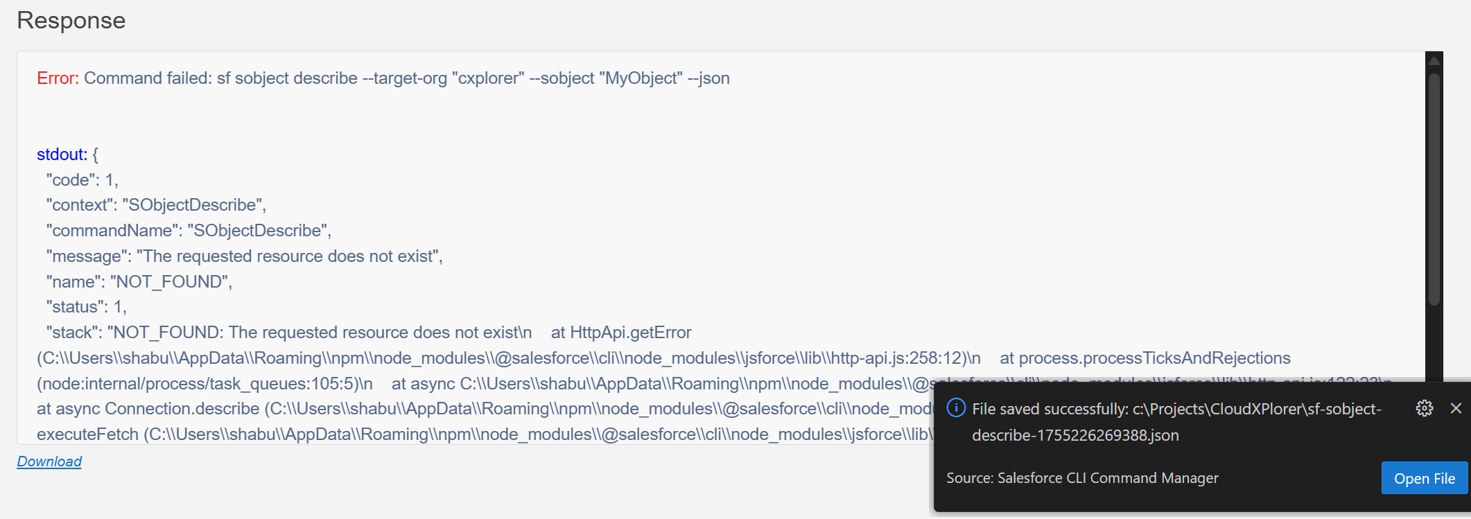 Download a JSON file containing the full command and its failed response for documentation or sharing purposes, with notification.