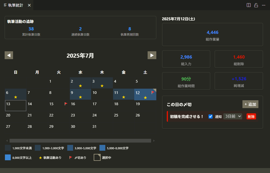 タイマー機能や文字数カウントはもちろん、〆切カレンダーなども備え、執筆の習慣化をサポートします。