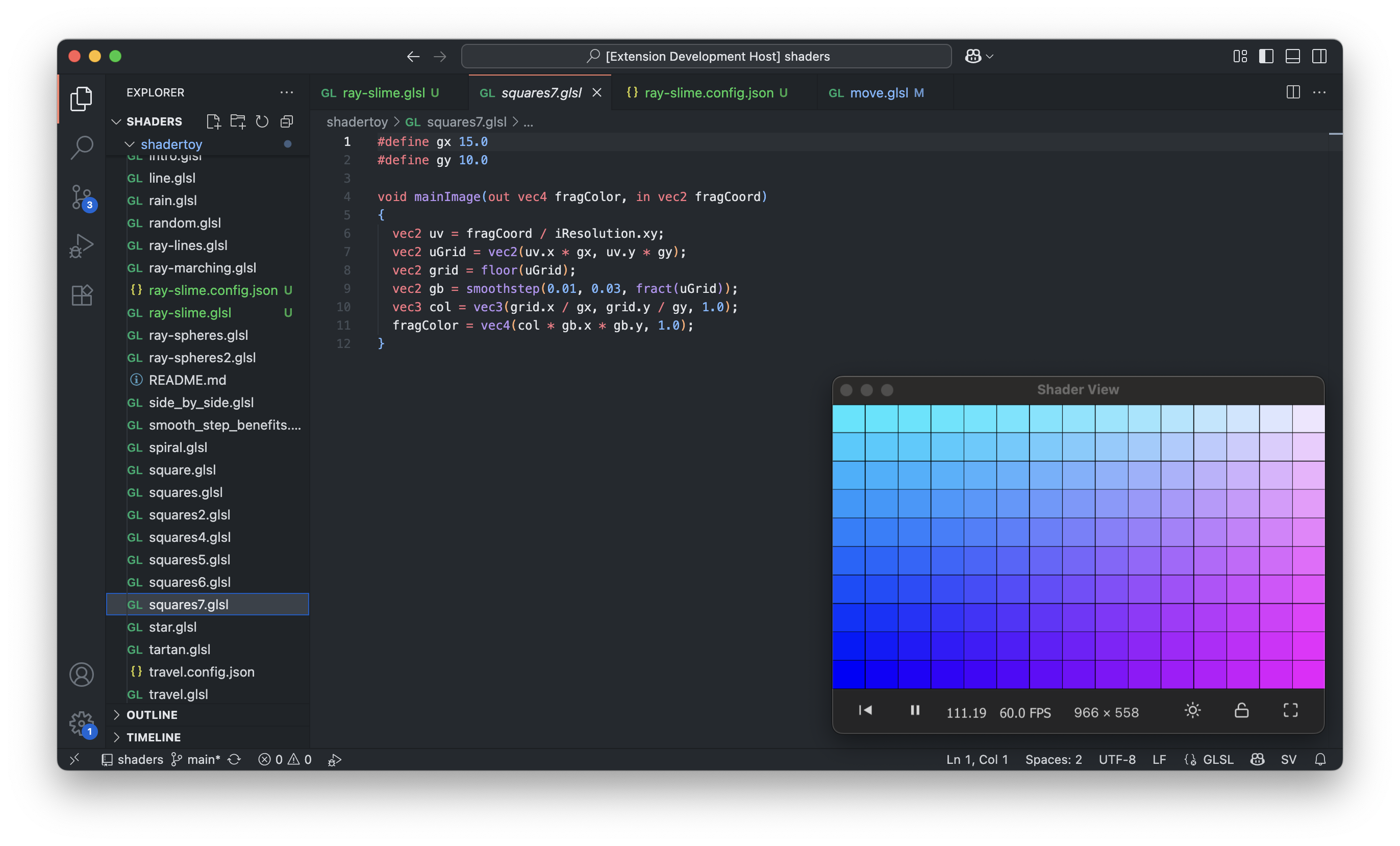 Shader StudioA GLSL fragment shader viewer for VS Code with hot reloading, designed specifically for Shadertoy-style shaders. See https://www.shadertoy.com for more information on the format and to see some cool shaders.