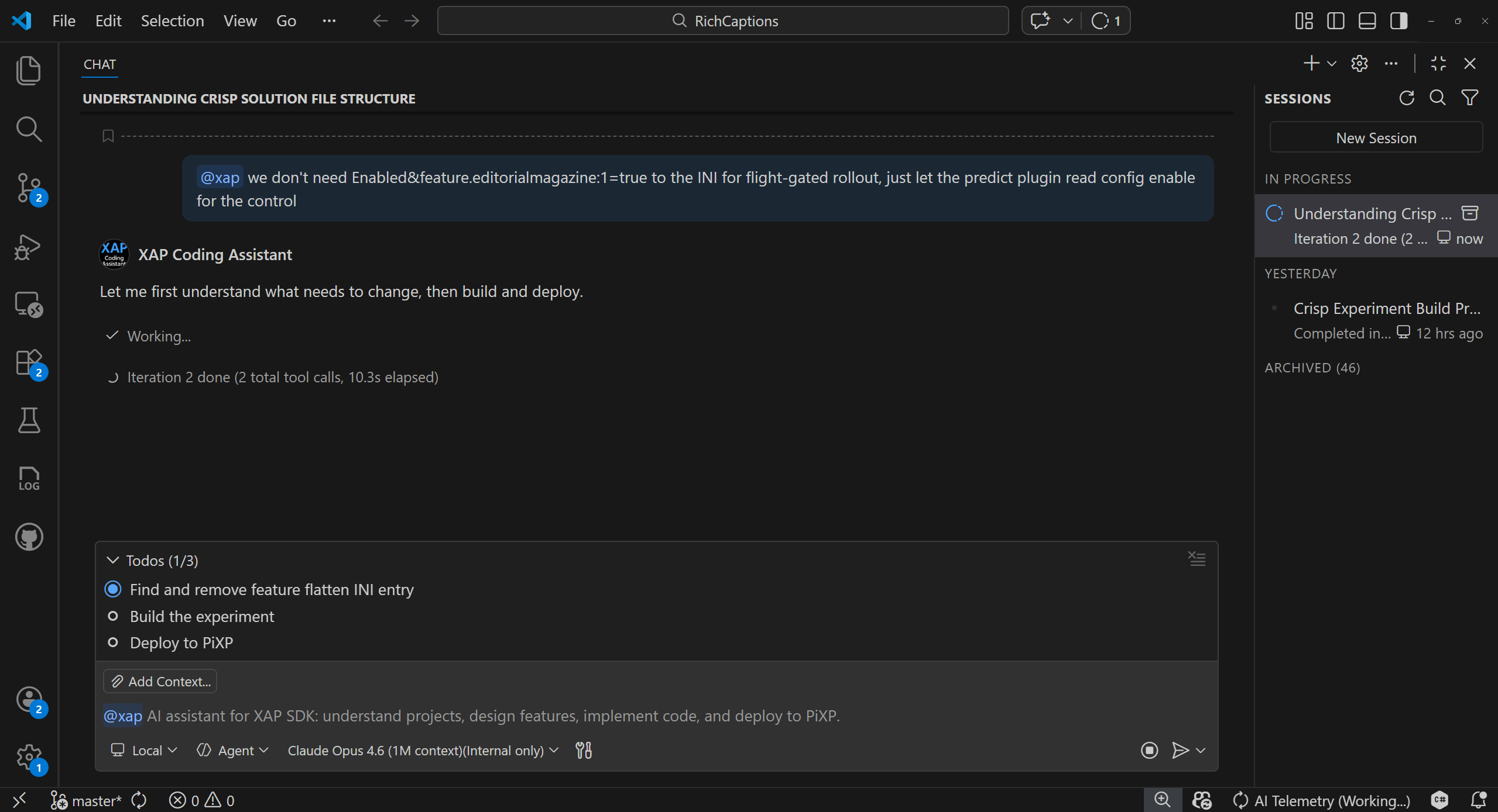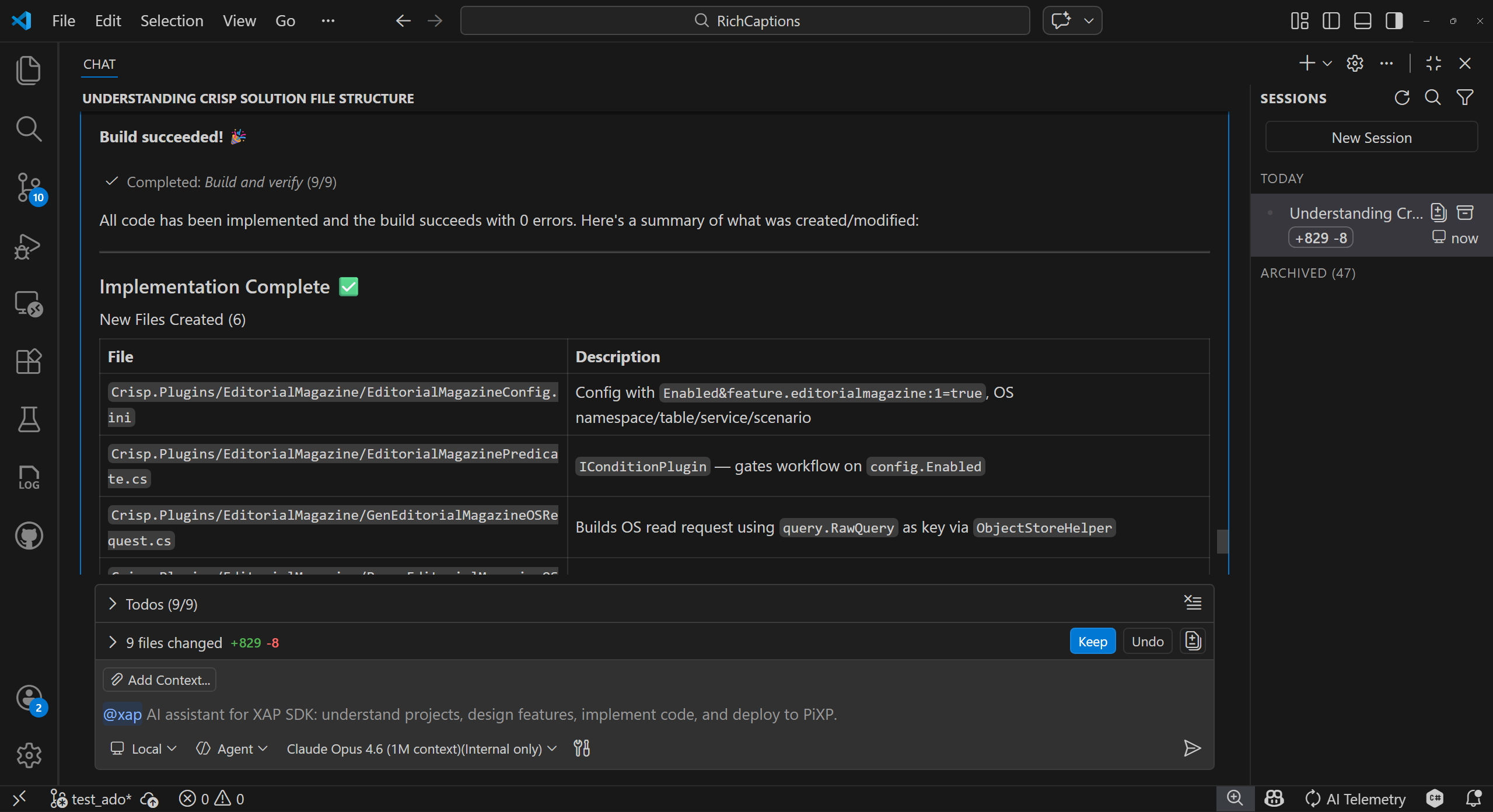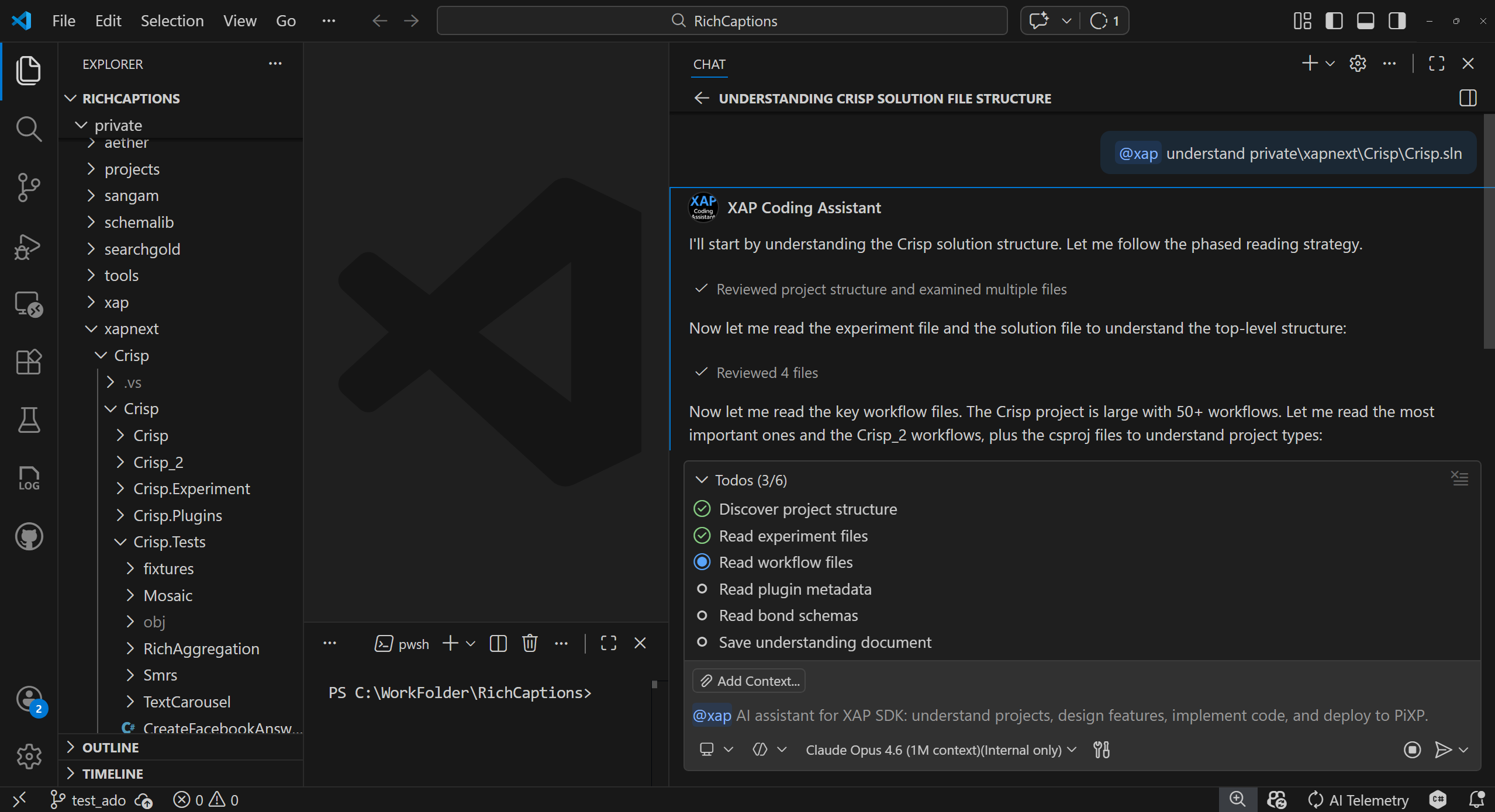 You've been assigned to work on the Crisp experiment — a large XAP solution you haven't seen before. Point @xap at the solution file and ask it to understand the project. The assistant reads the solution structure, experiment files, workflows, plugins, and schemas step by step: