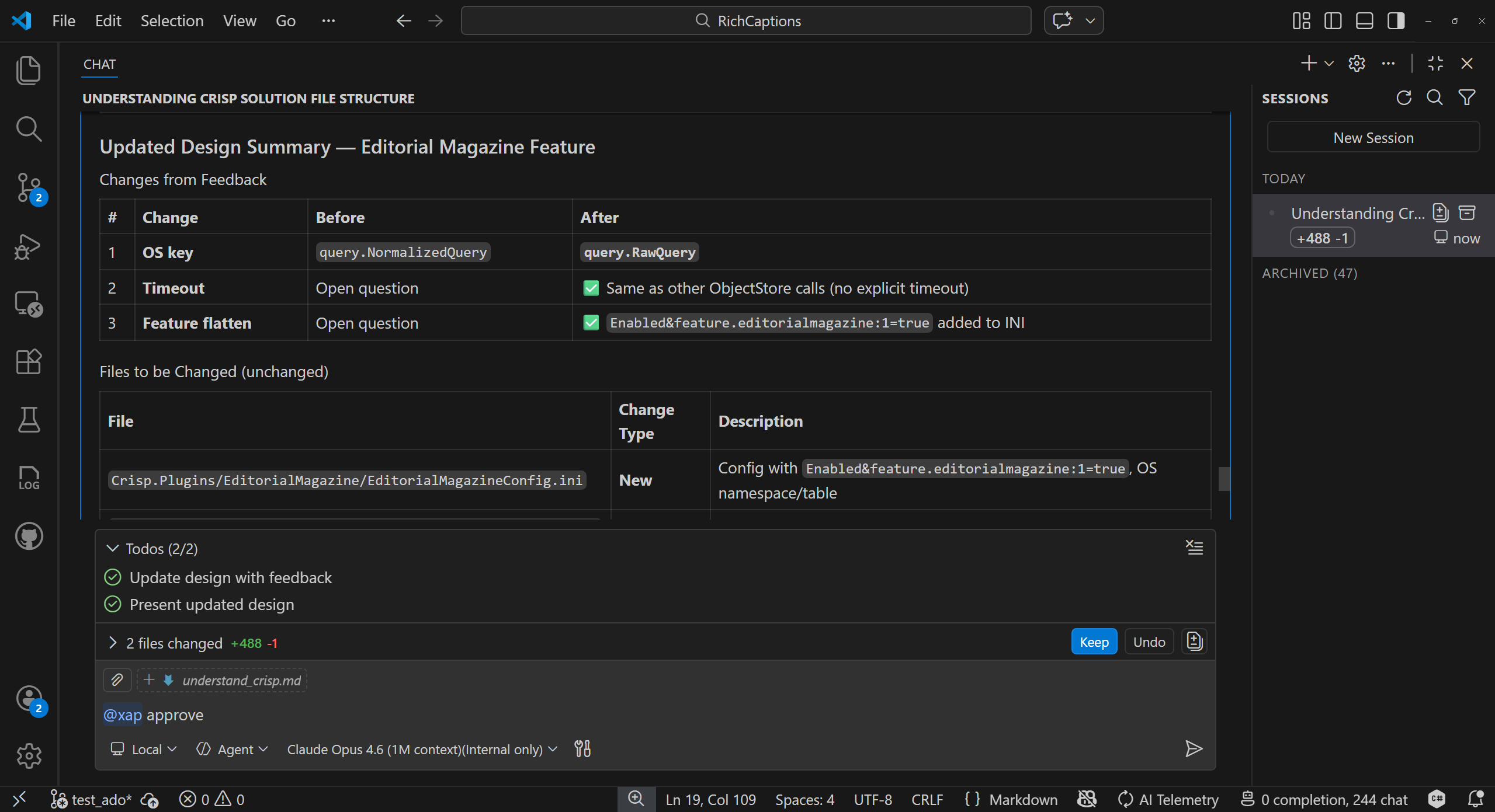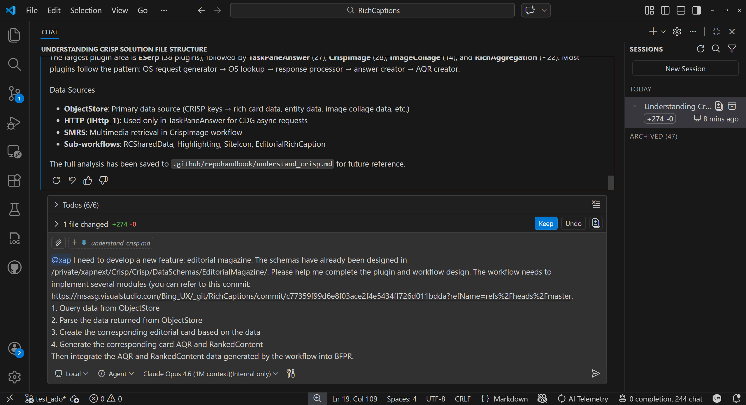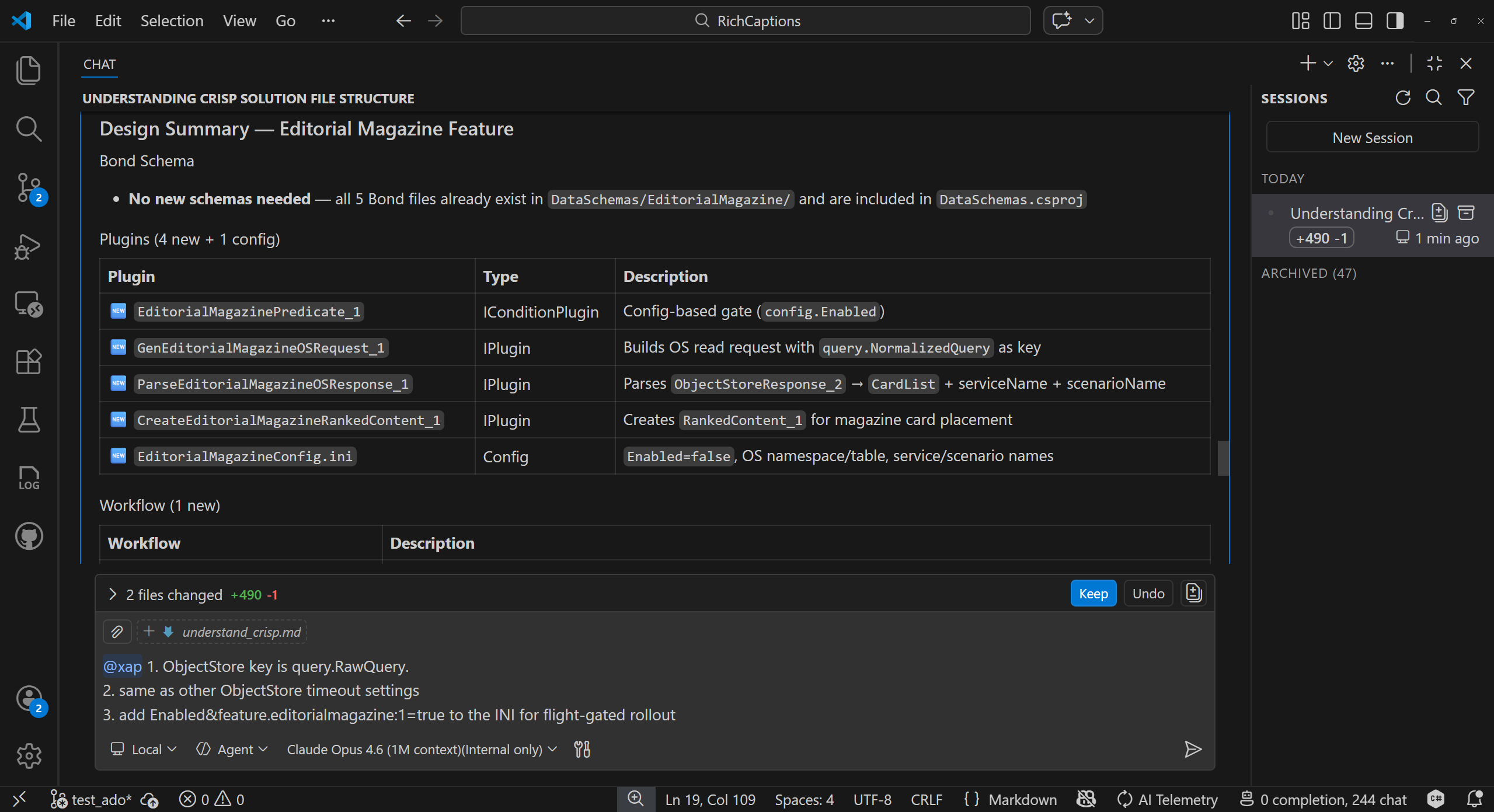 Now you need to add an Editorial Magazine feature — a new workflow with multiple plugins. You describe the requirements in detail, referencing existing schemas and an ADO commit for context. For complex changes like this, the assistant first creates a detailed design document (saved to your workspace for future reference) and presents a design summary in the chat for your review before writing any code — listing Bond schemas, plugins, configs, and workflows it plans to create: